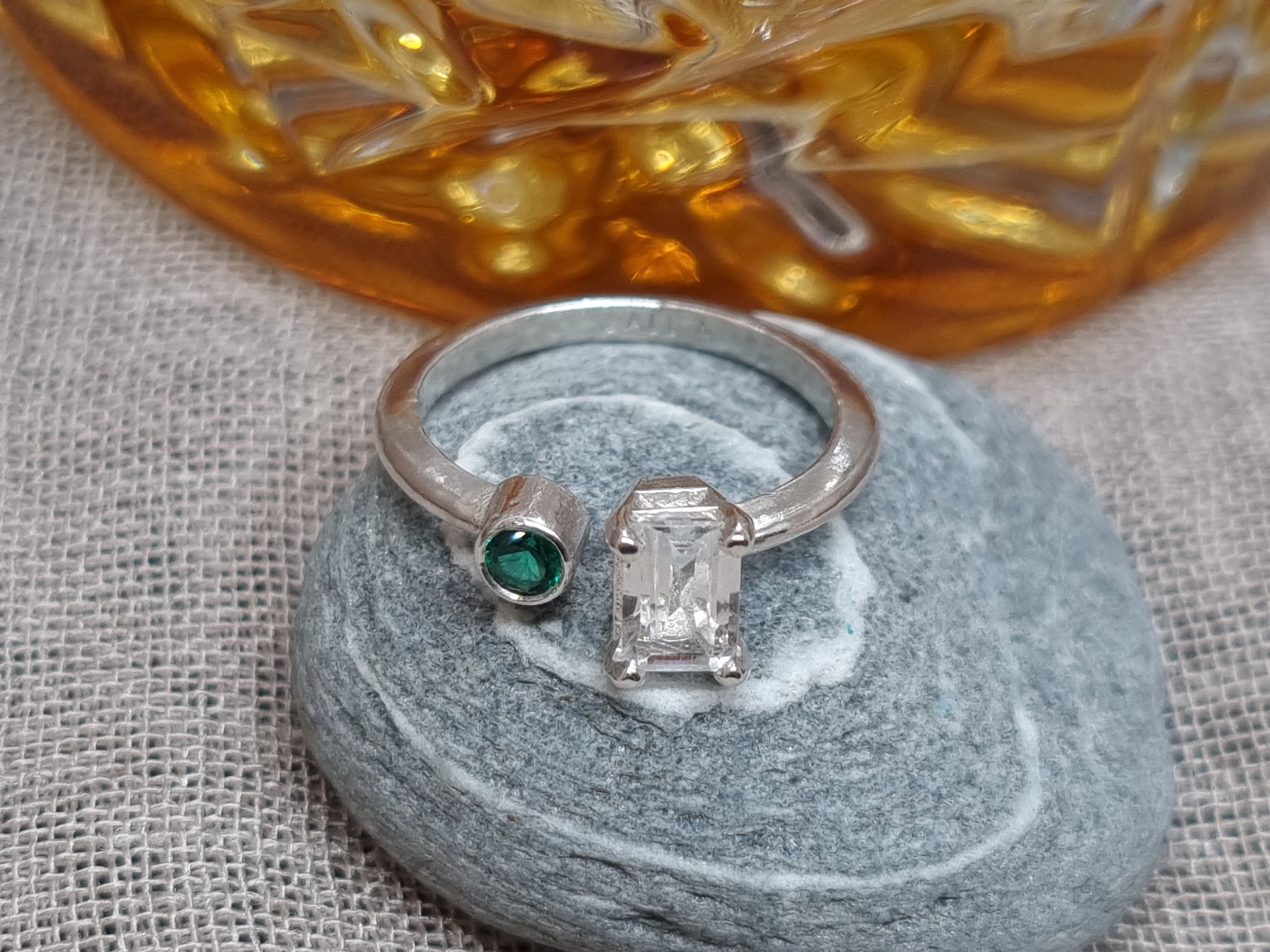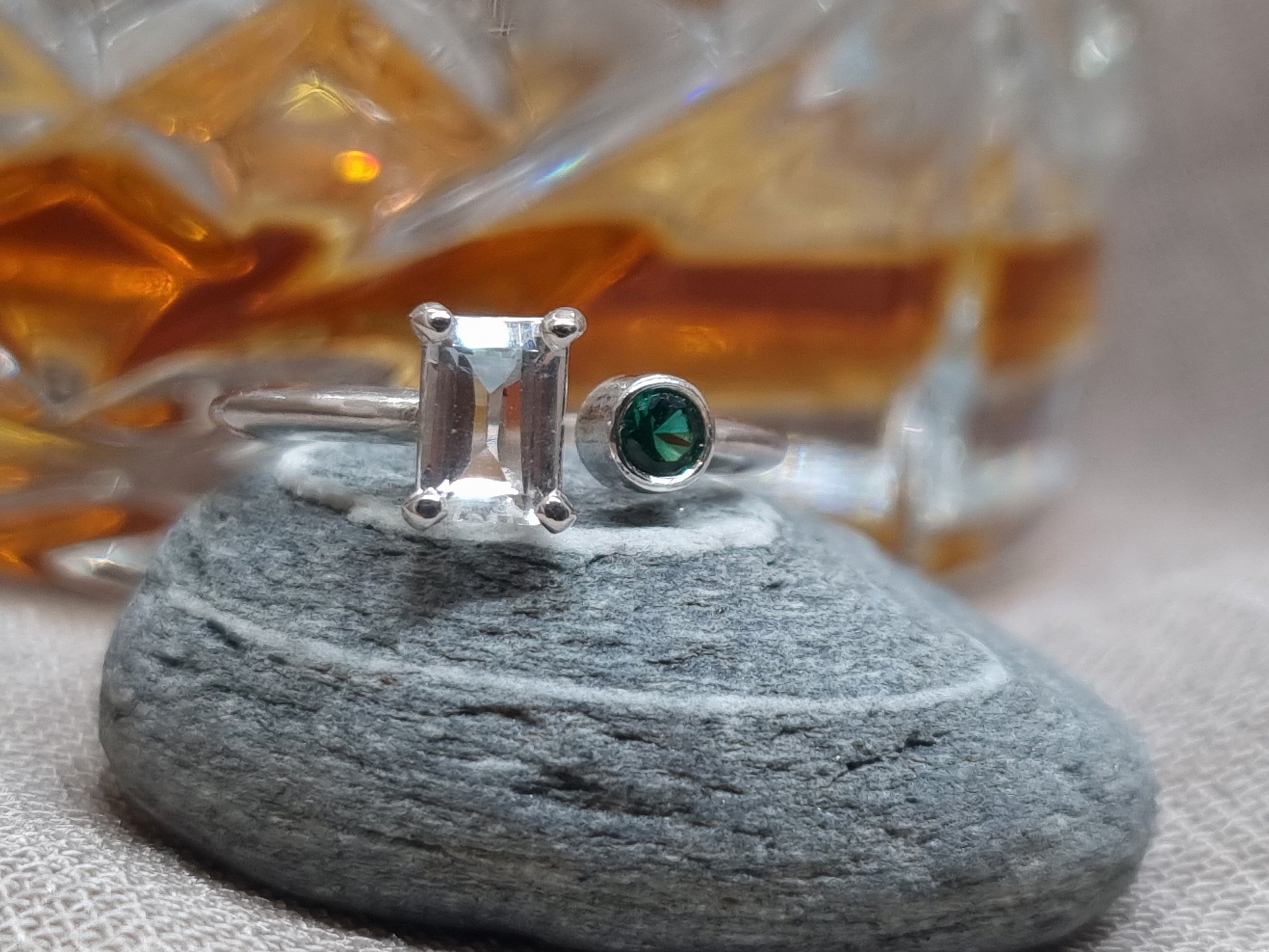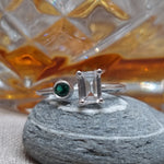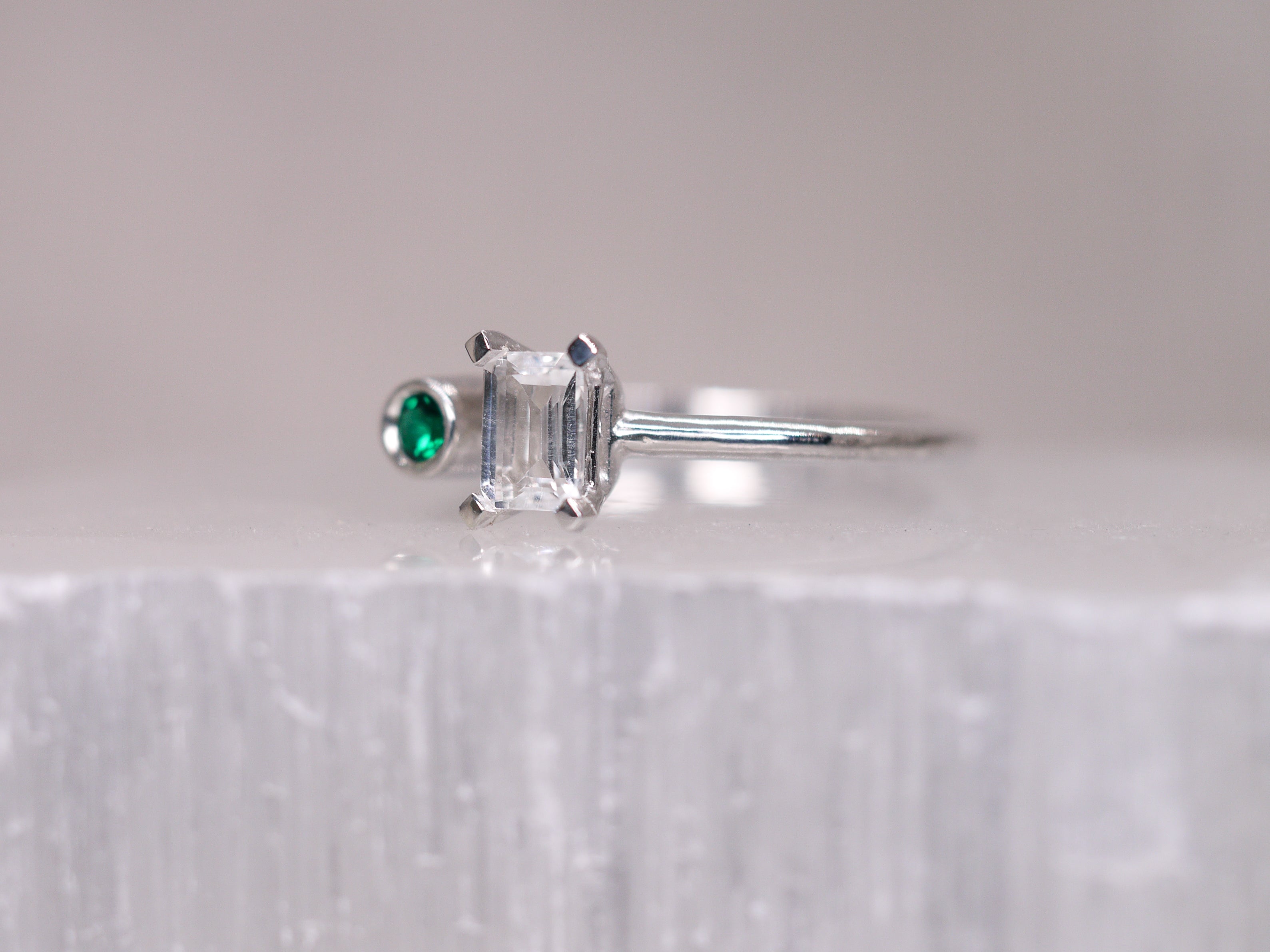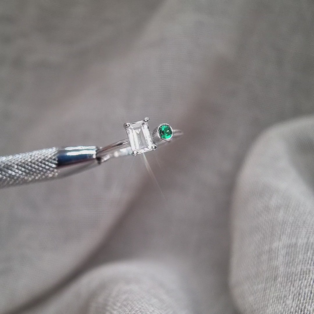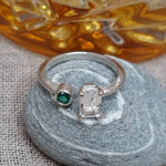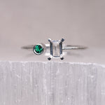 Oo la la. Echo is an asymmetrical, understated beauty. A striking contrast between the emerald cut White Topaz and a vivid accent Green Emerald. Echo can also be made in 9k Gold as a spunky alternative engagement.