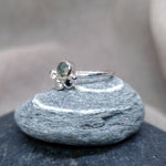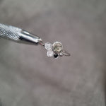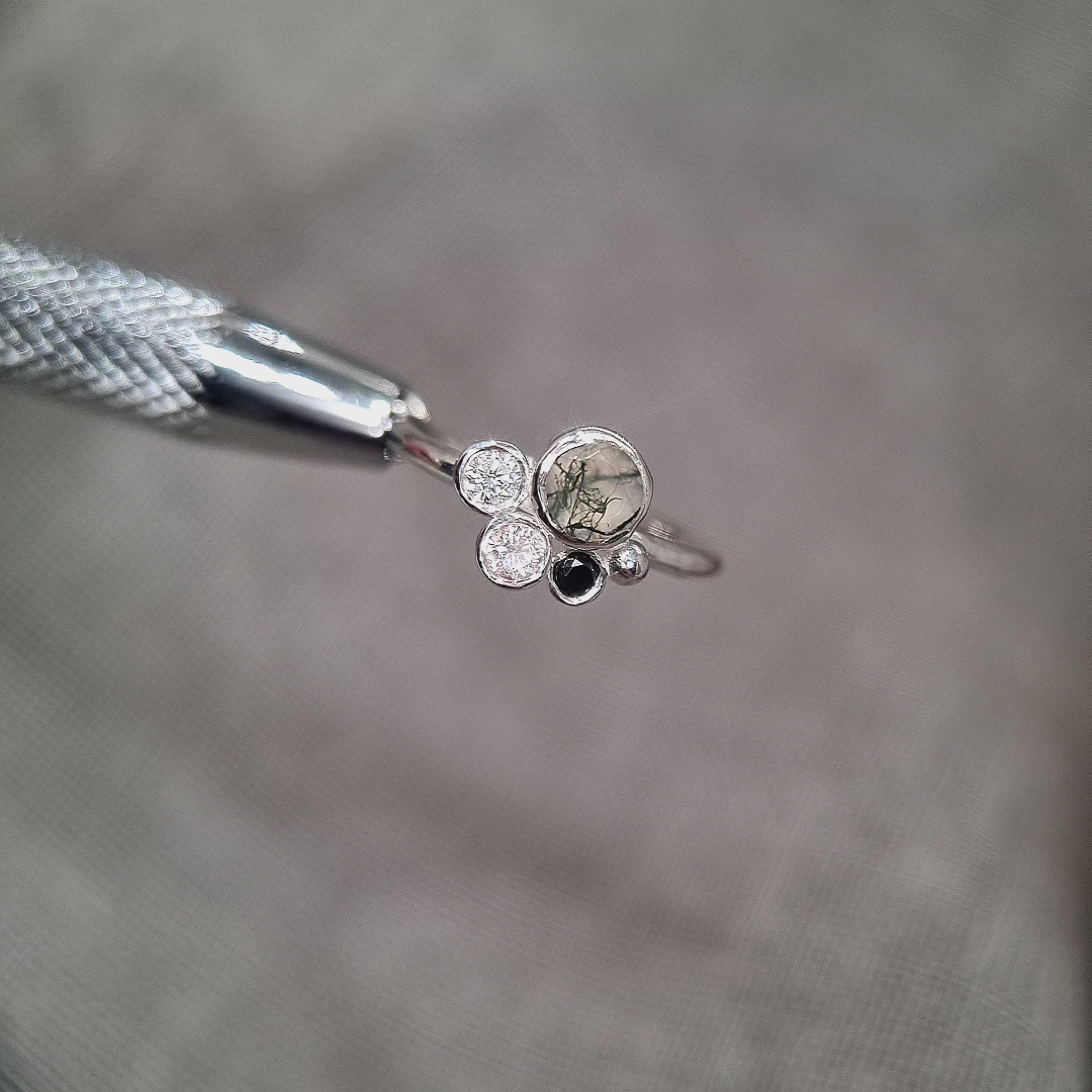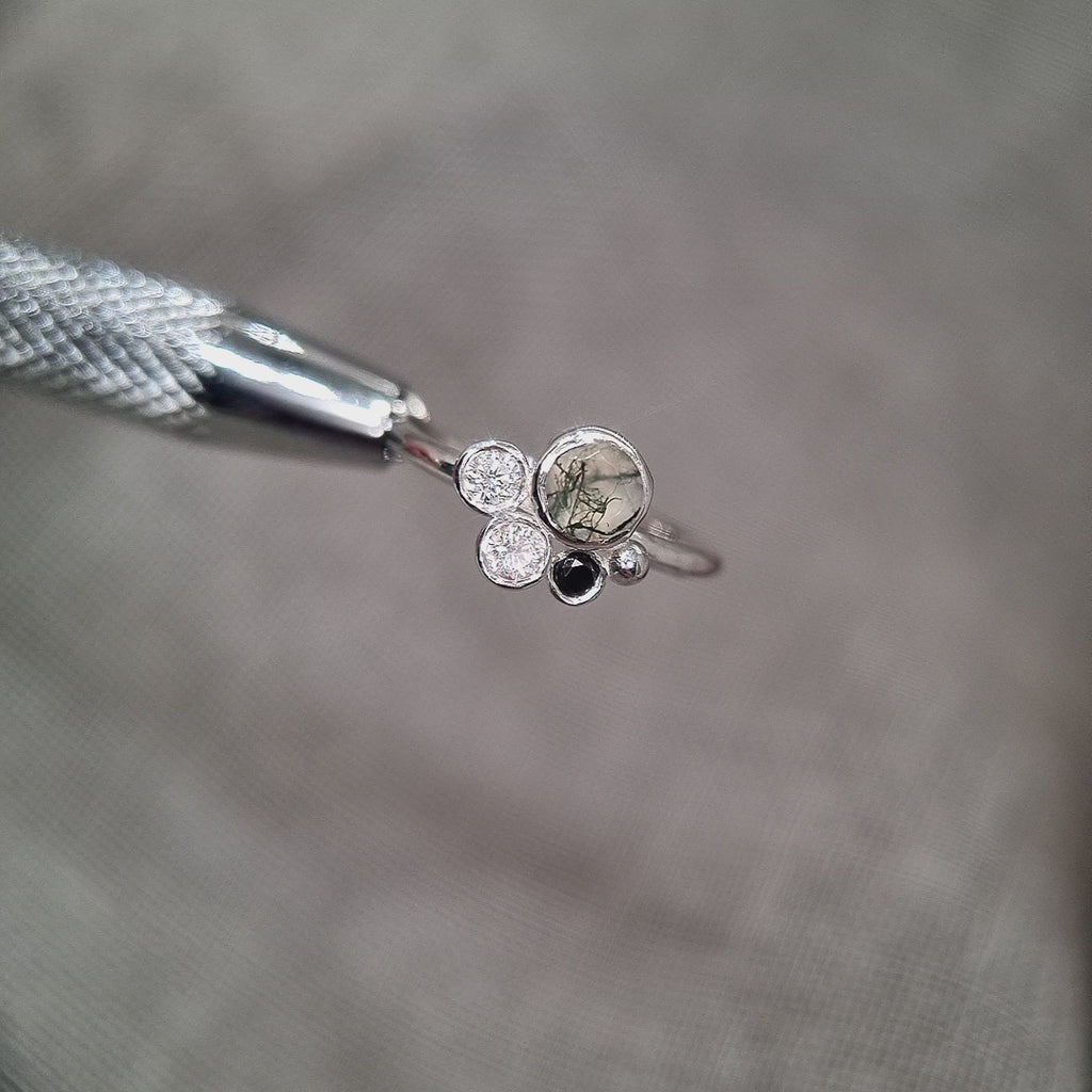 Inspired by its namesake, Halley is a fantastic matter with a trailing tail of stones - in this version, the comet is a unique Moss Agate, encompassed by a tail of White Sapphires and a Black CZ. Halley is a dainty little thing and can also be made in 9k Gold.
