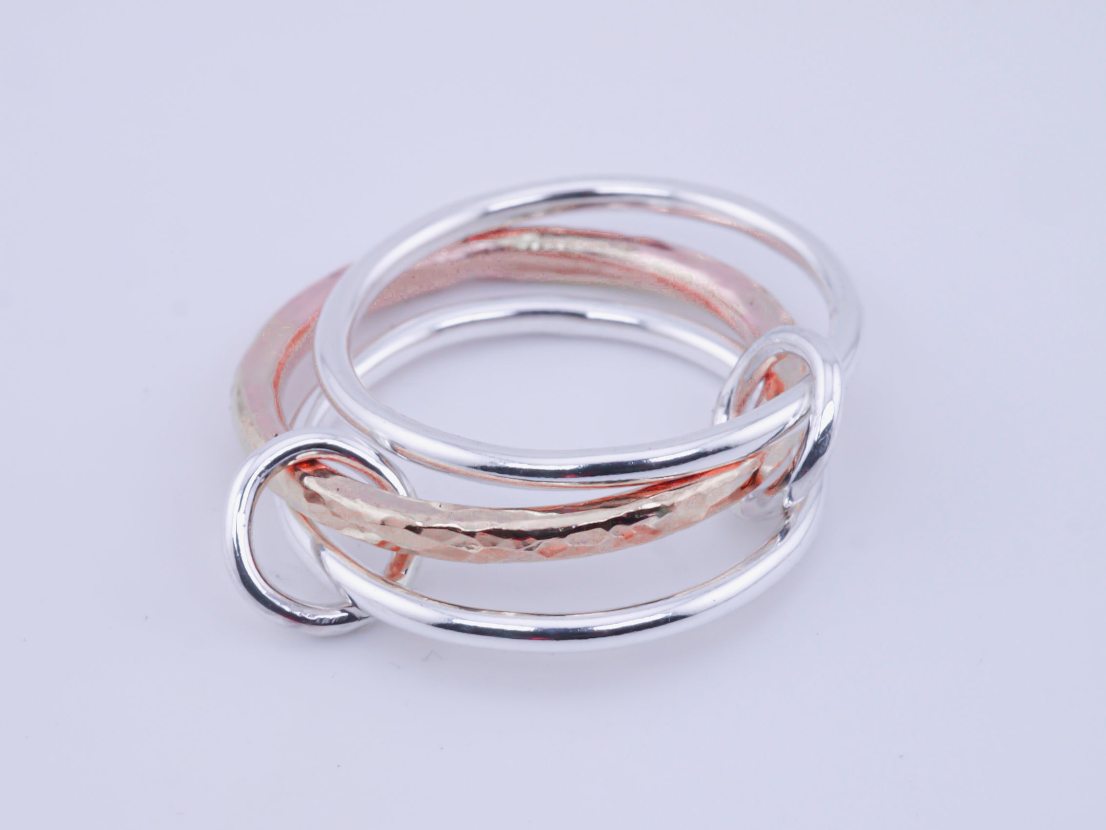 An elegant set of Halo rings linked by miniature rings to create a statement stack. Simple, yet curiously distinctive. The centre ring can be made in Silver or 9k Gold, and comes made with a hammered texture.