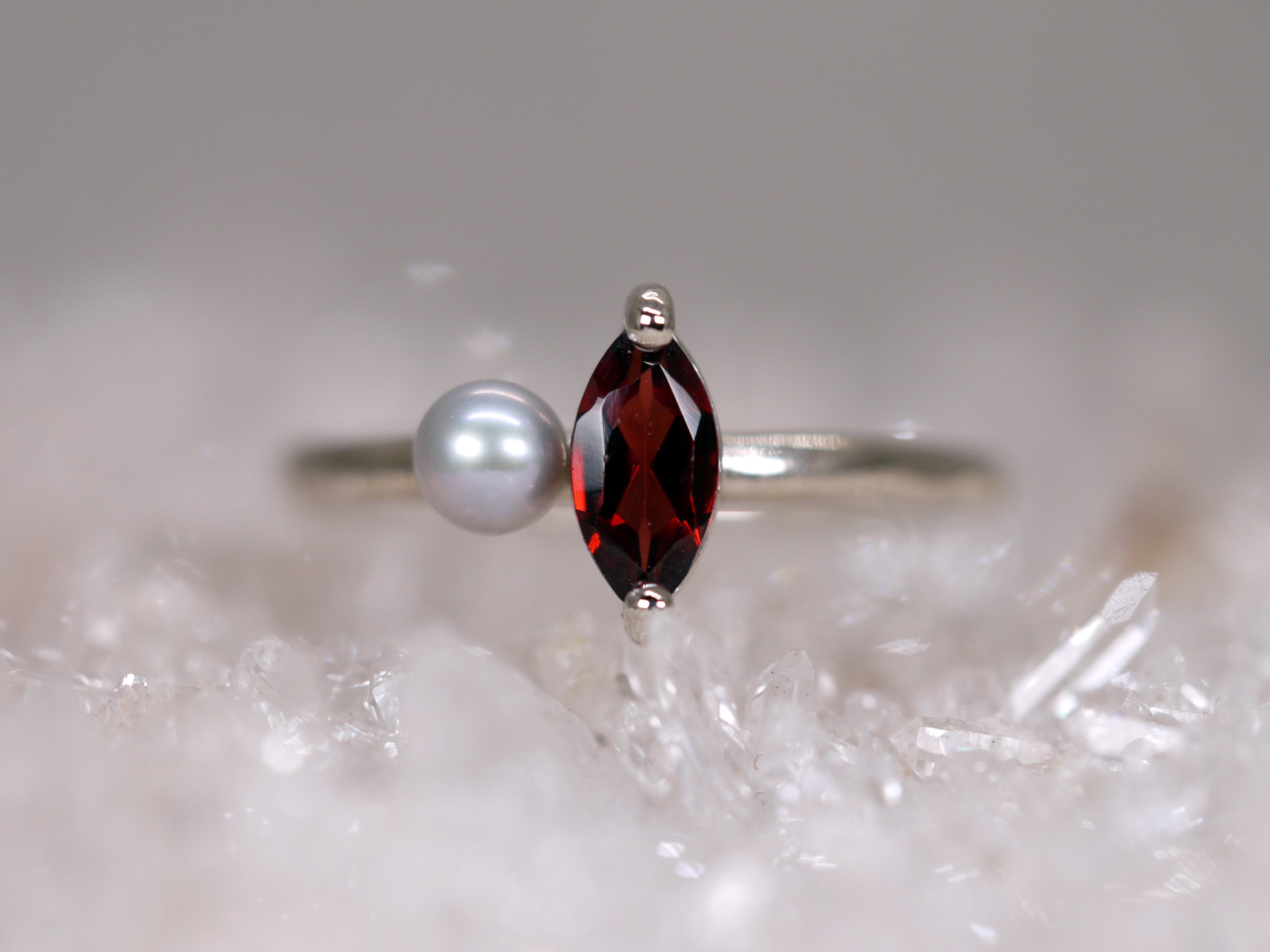 LUCIA Duet Ring - Red Garnet Marquise & Grey Freshwater Pearl