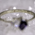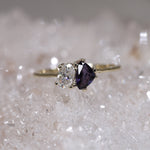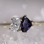 One of a kind deep purple trillion cut Sapphire, set with a leaning oval Moissanite. A unique take on the Toi et Moi setting of two stones - one to represent each partner.