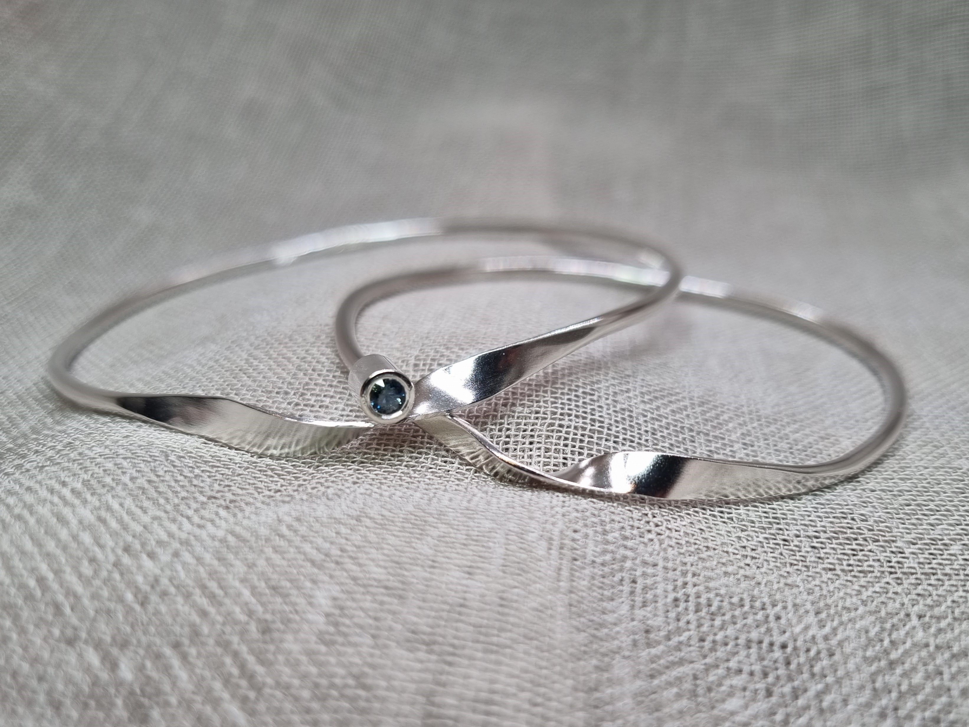 The Hybrid Mobius Bangle is 2mm wide and handmade with a Mobius centre segment.