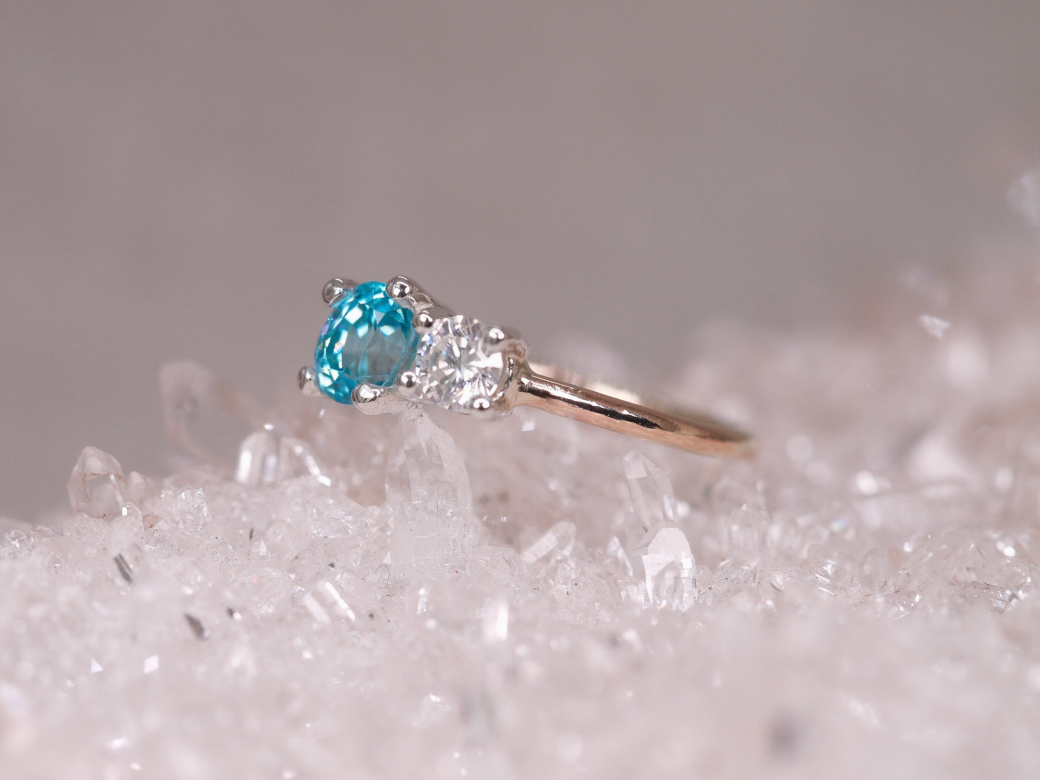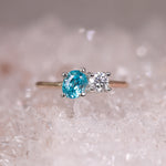 A vivid blue oval cut Zircon, set leaning on a bright brilliant cut Moissanite. A mesmerising take on the Toi et Moi setting of two stones - one to represent each partner.