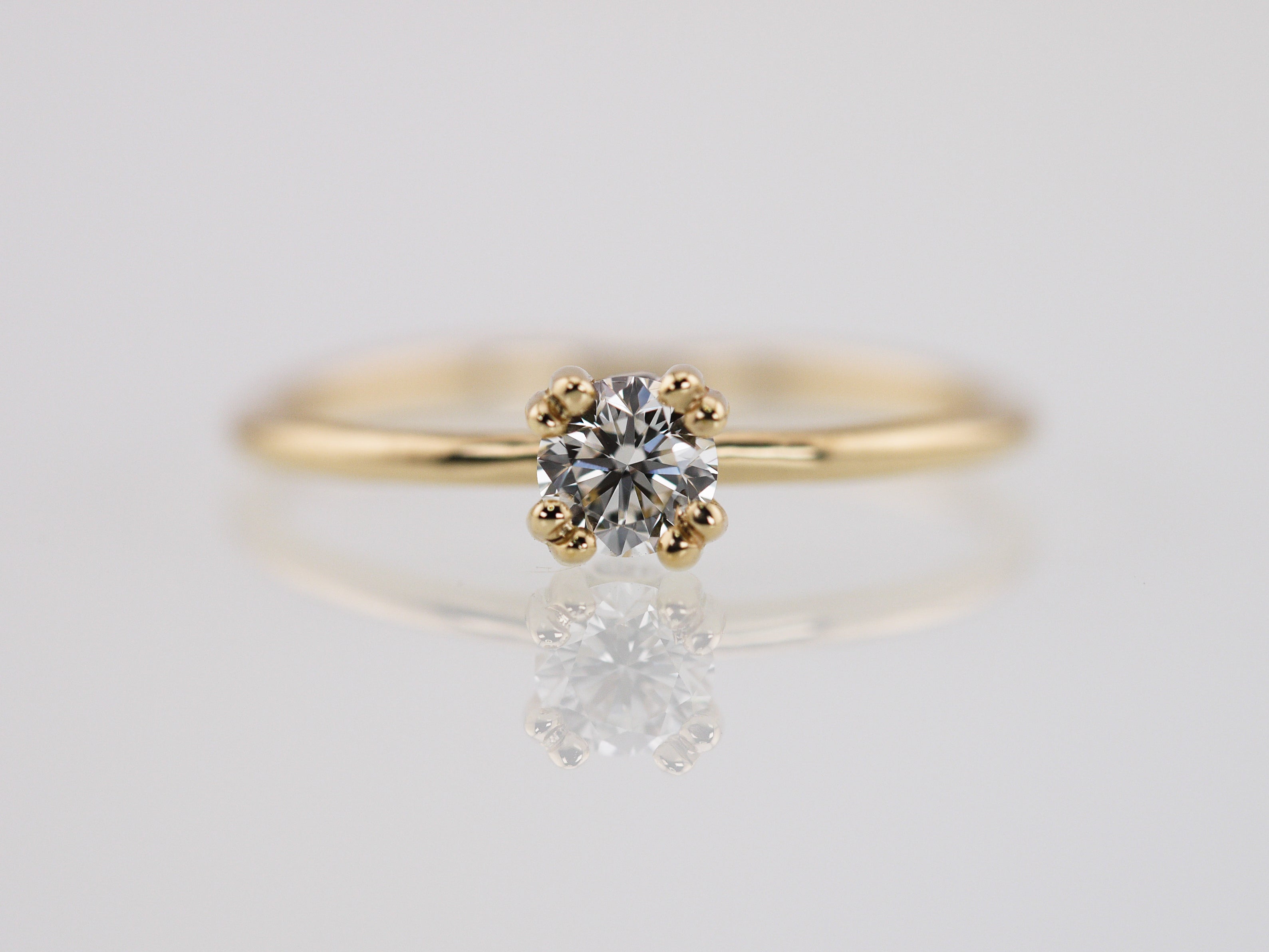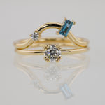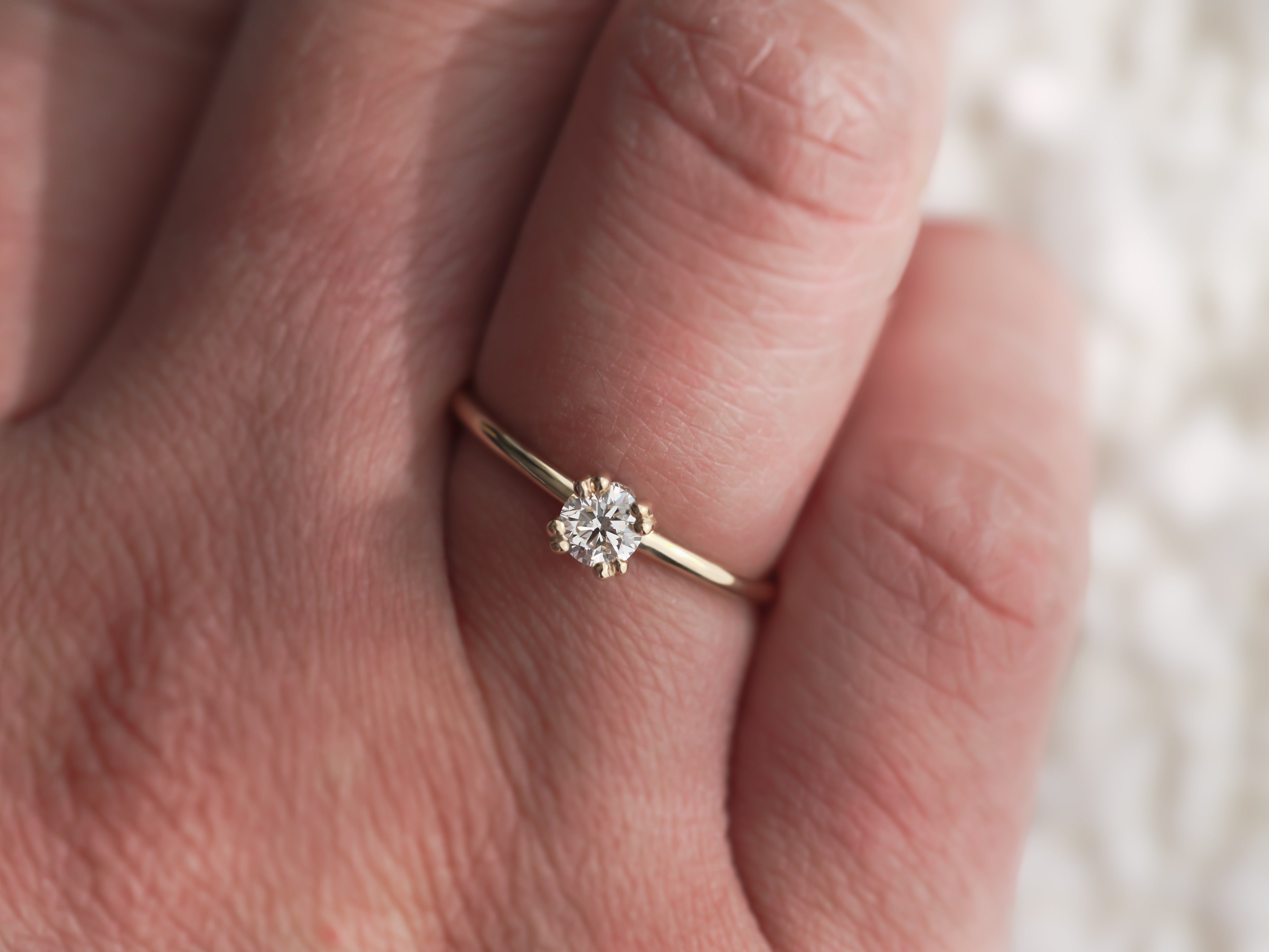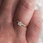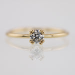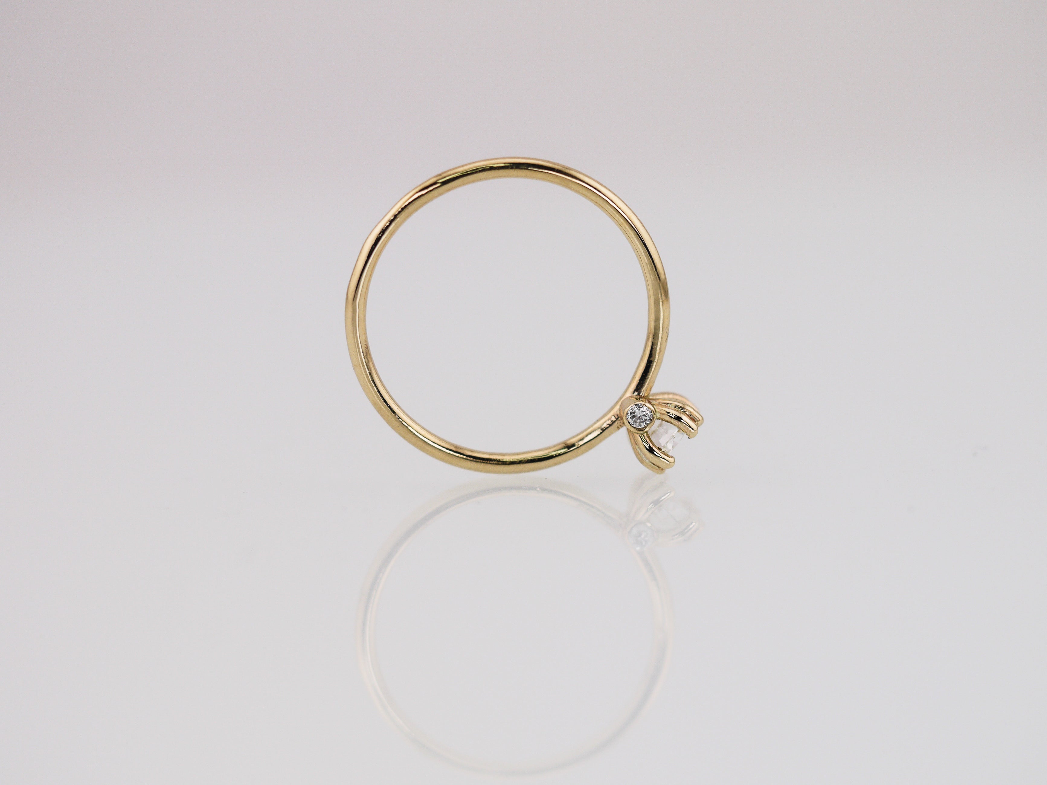 Meliae II is a dainty ring with a 1.2mm band. The center 4mm Lab Diamond (E-F colour, VS2, 0.25ct) is ornamentally set with double prongs and accented by two 1.5mm Lab Diamonds (E-F colour, VS2) within its side profiles. Perfect as an engagement ring or promise ring, it can be worn as a stand alone or stacked with stone encrusted bands.