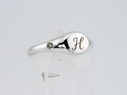 Dainty Round Signet Ring with Green Sapphire - Personalised Initial