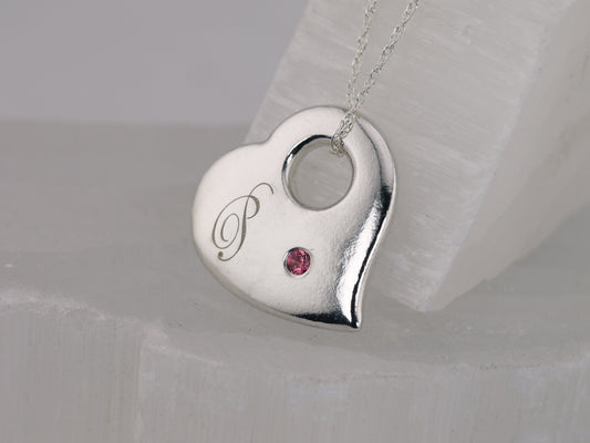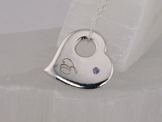 Personalised Engraved Puffy Heart Pendant - Back Side Engraving and Second Birthstone