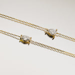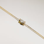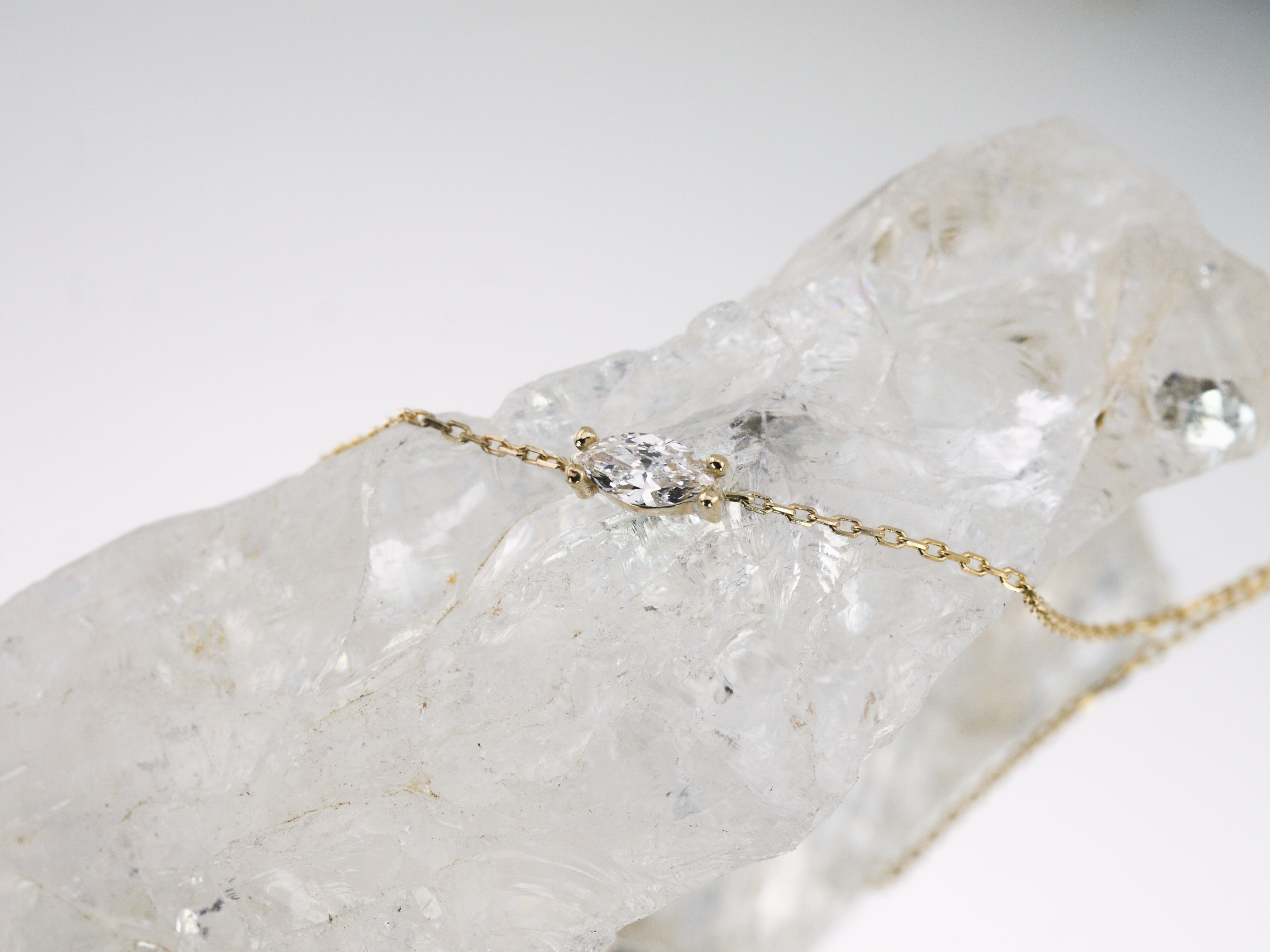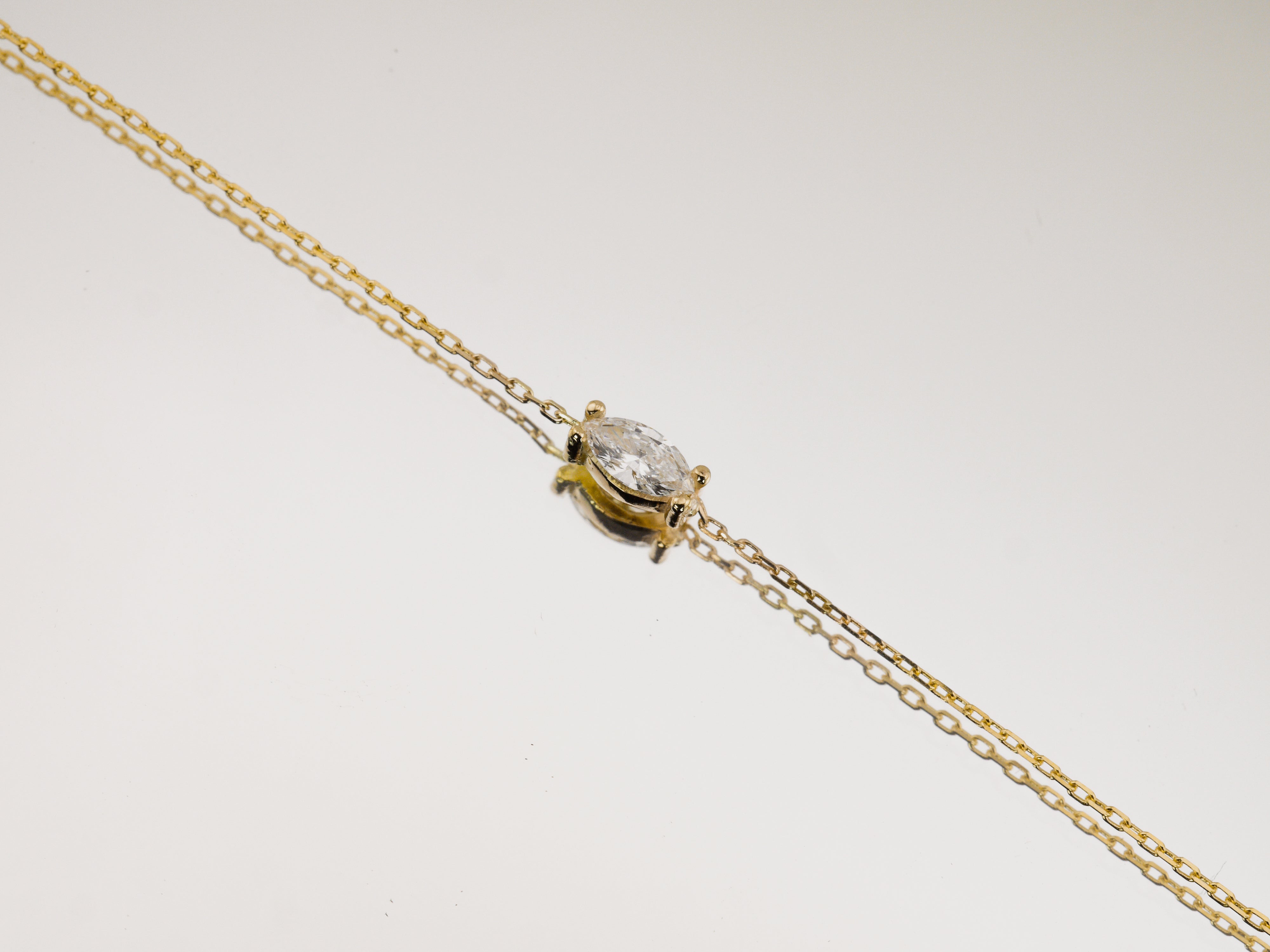 A delicate dance of shimmering light. This piece features a 0.20ct east-west set marquise cut lab grown diamond set on a dainty 9k gold chain. The Aura Bracelet is designed to effortlessly capture the light and add a touch of sophistication to any occasion. Its understated elegance makes it perfect for wearing alone or layering with other treasured pieces on a daily.