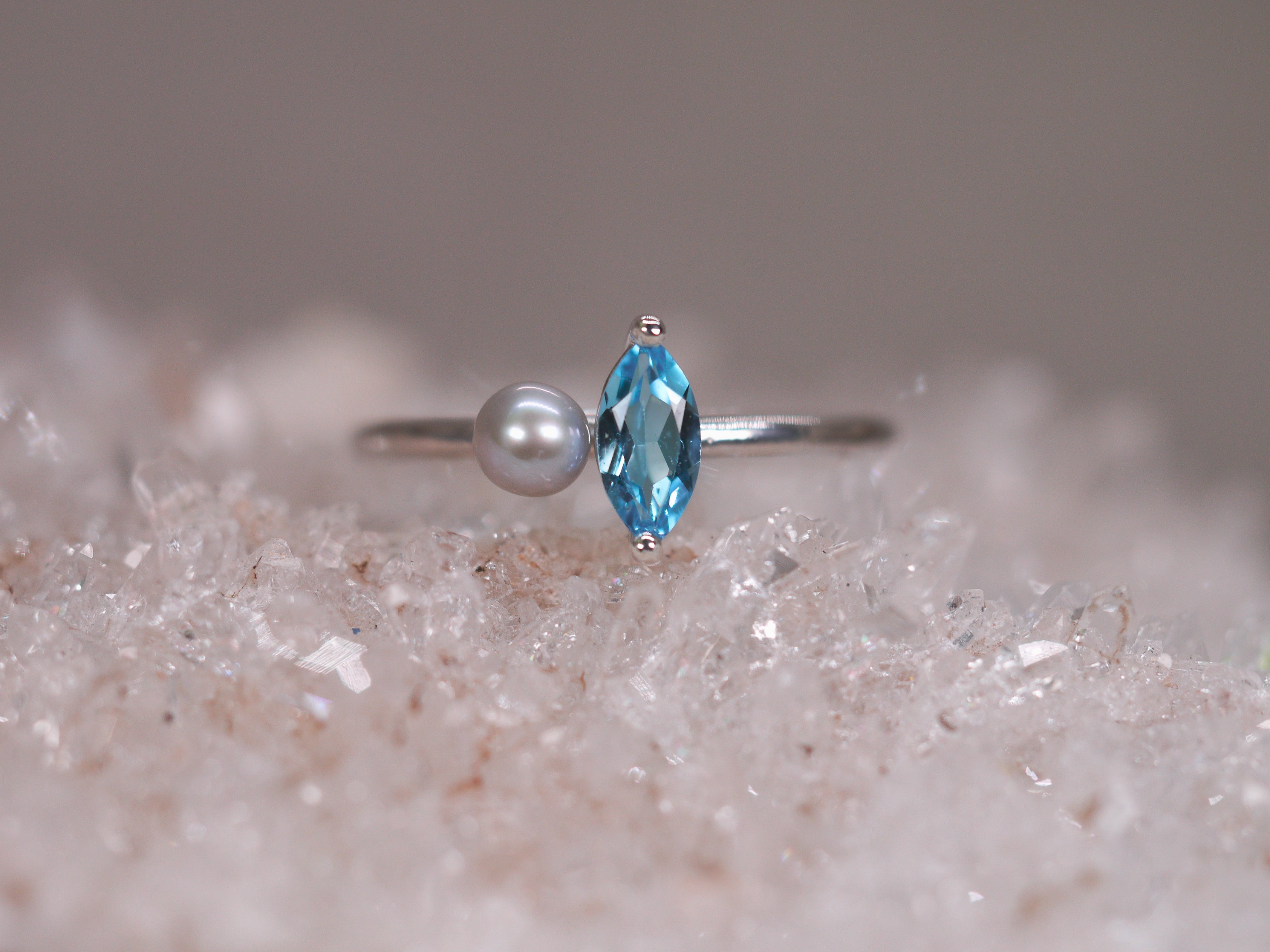 LUCIA Duet Ring - Swiss Blue Topaz Marquise & Grey Freshwater Pearl