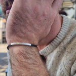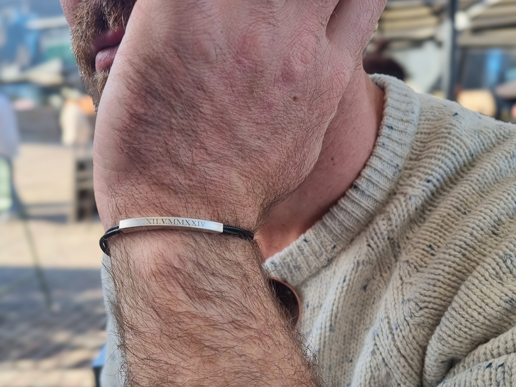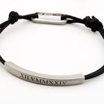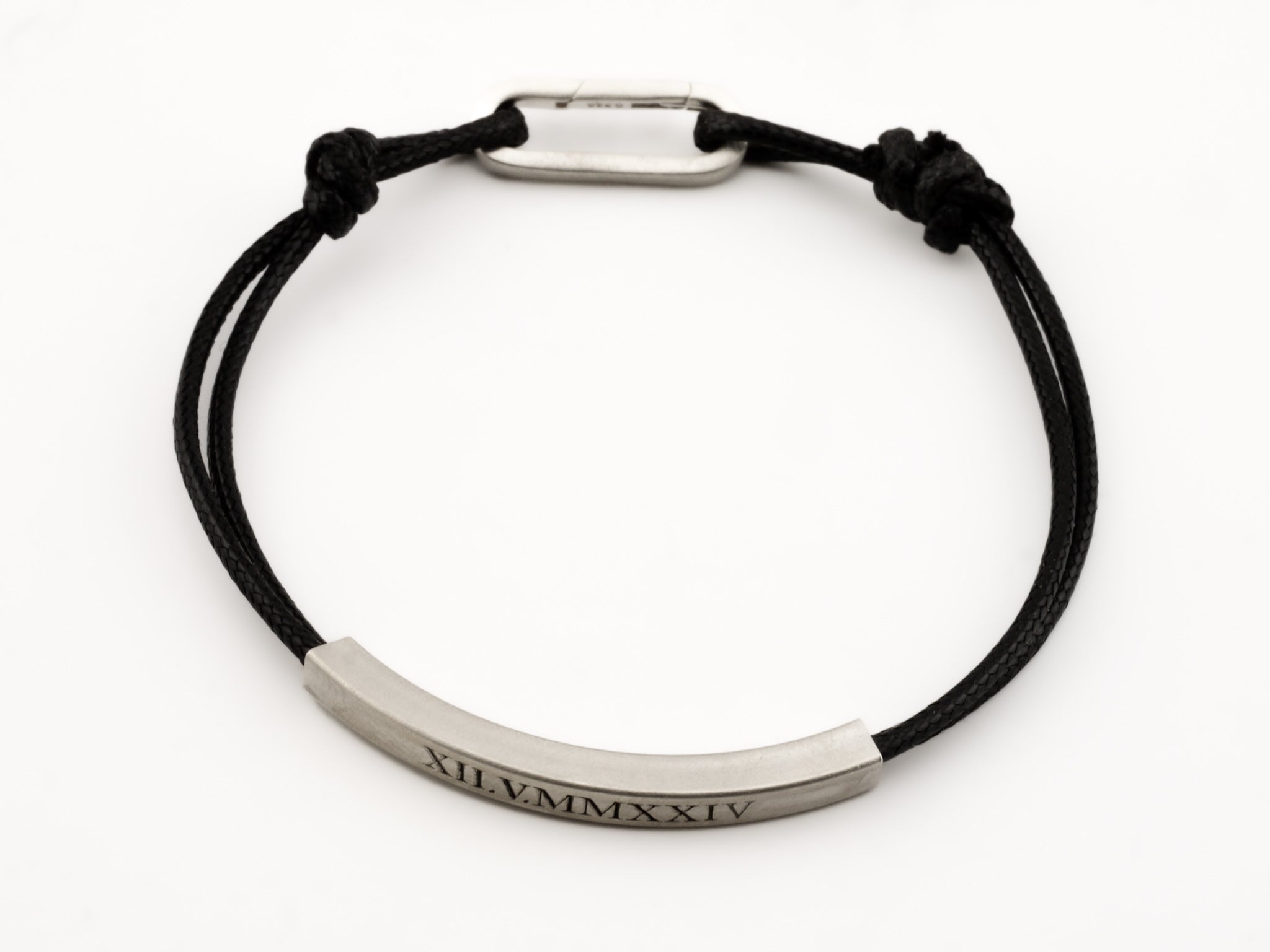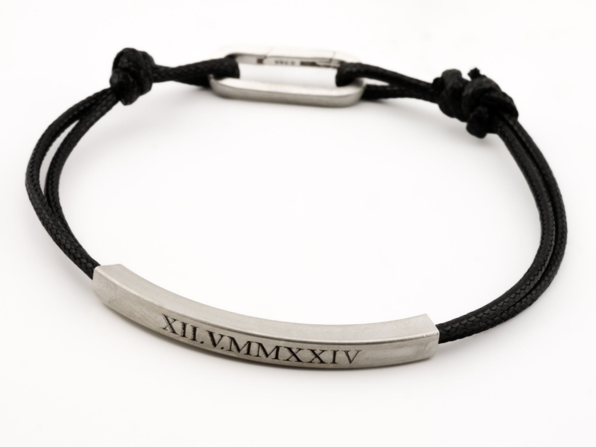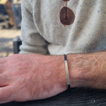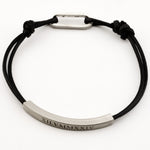 Wax cord bracelet with a 4mm wide sterling silver engravable square tube, neatly secured with a sterling silver trigger carabiner.