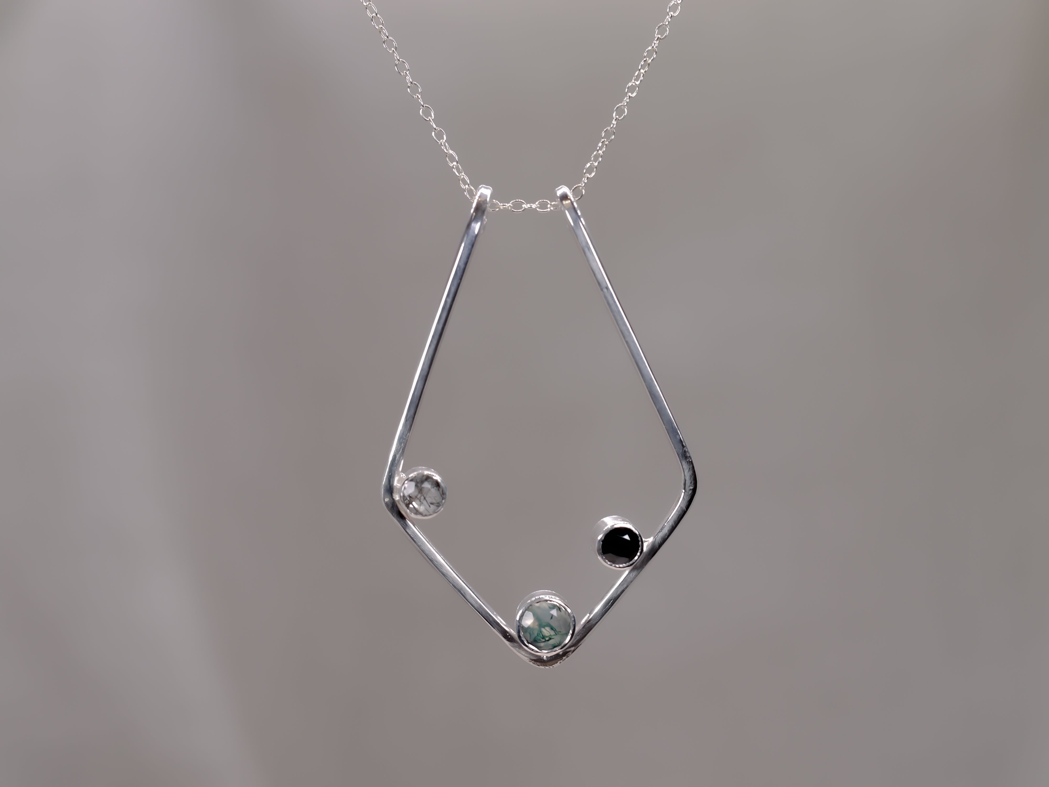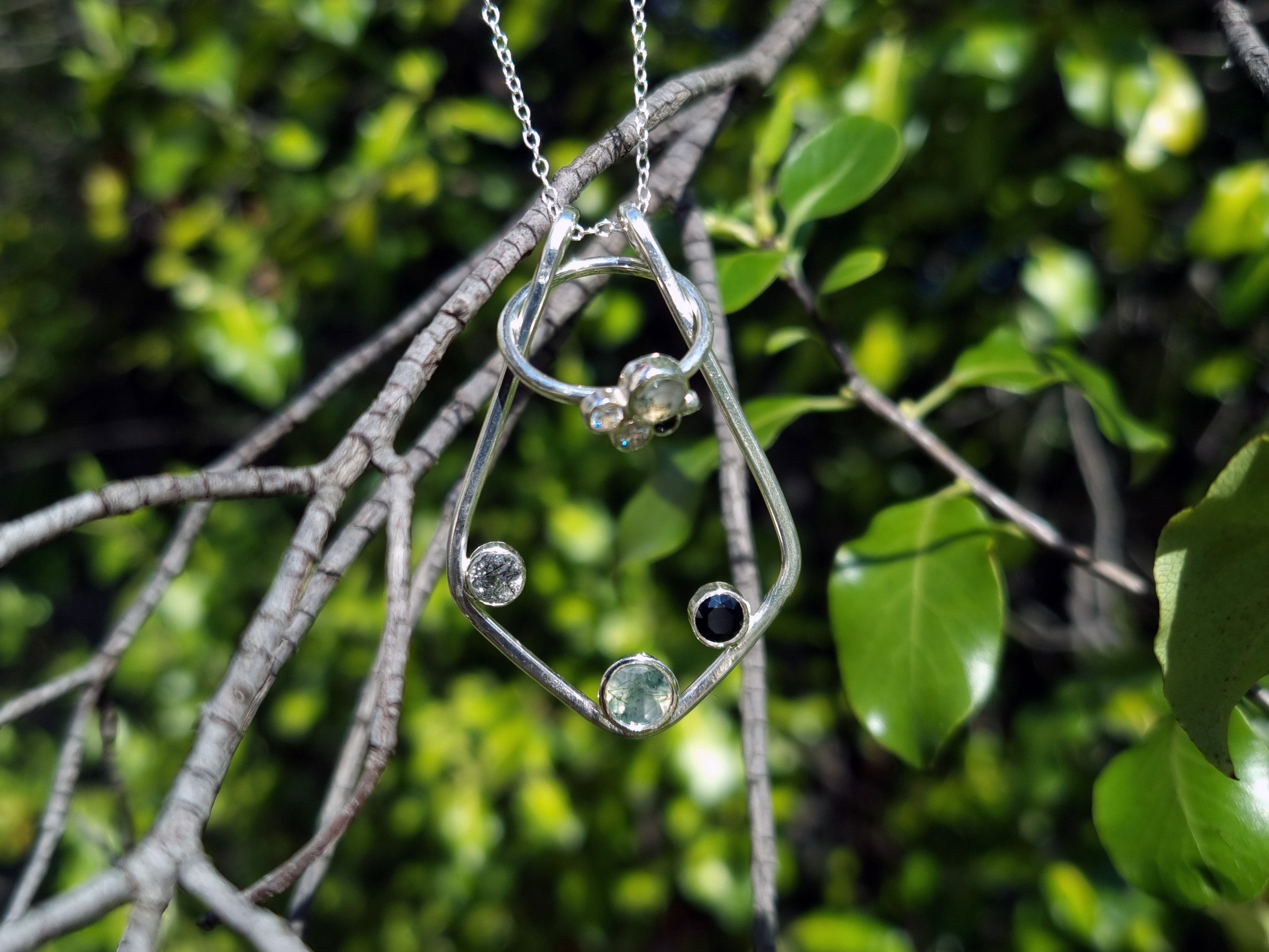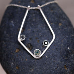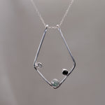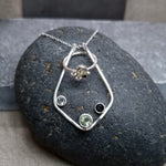 This KAI Ring Holder Necklace has a touch of natural forest elements added to the original version. It is both functional and so pretty to wear! It features three bezel set stones and is on a chain length of your choosing. Each chain length also comes with an additional 5cm extender chain so you can customise where your necklace sits.