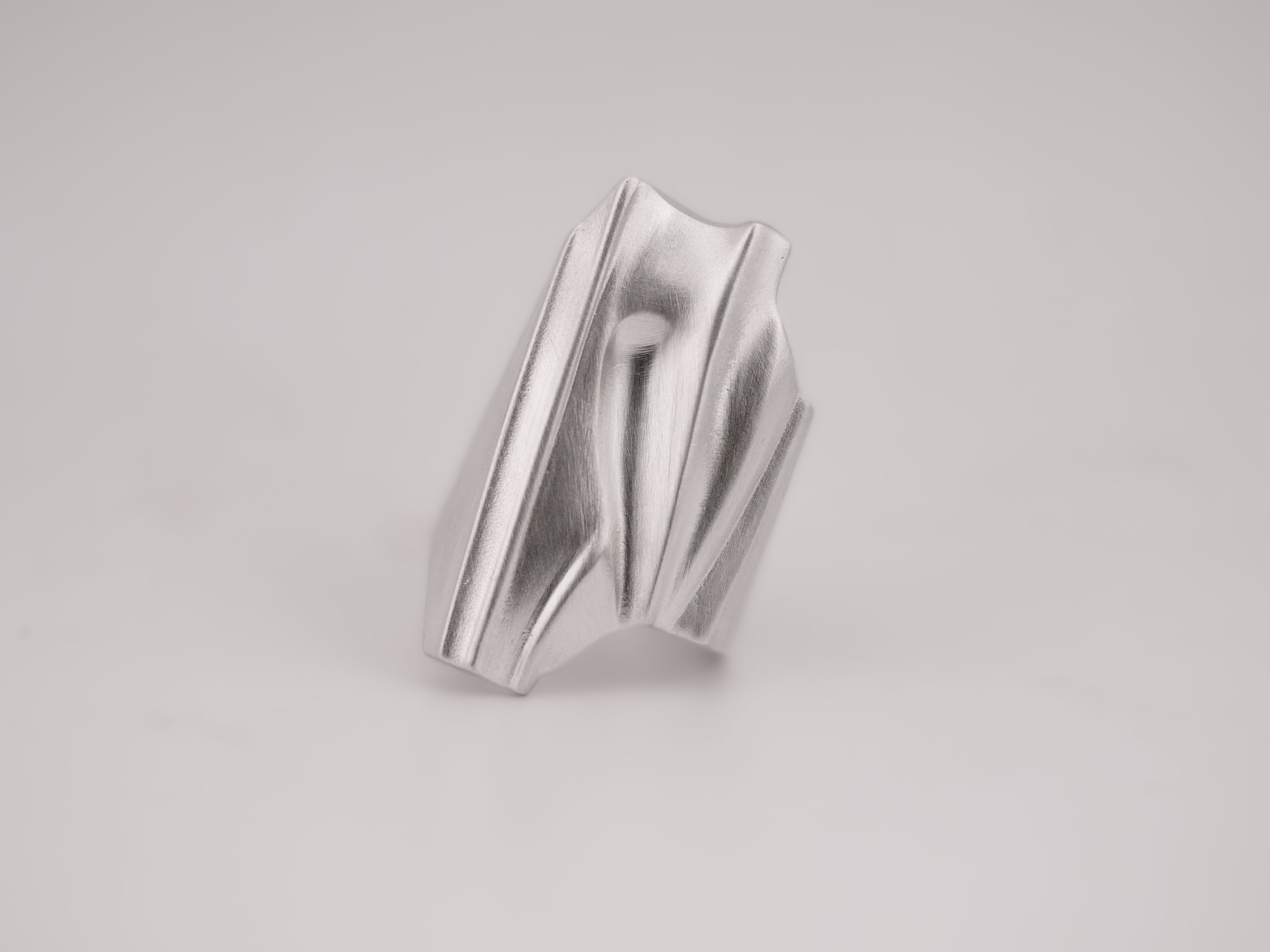The Draped Statement Ring is a bold piece crafted from sterling silver, designed to mimic the elegant folds of draped fabric. This weighty ring has a luxurious feel with its meticulously sculpted curves and textured surface that resemble flowing material. Its substantial heft ensures a statement-making presence on your finger, combining the refined beauty of silver with the sophisticated allure of a fabric-inspired design.