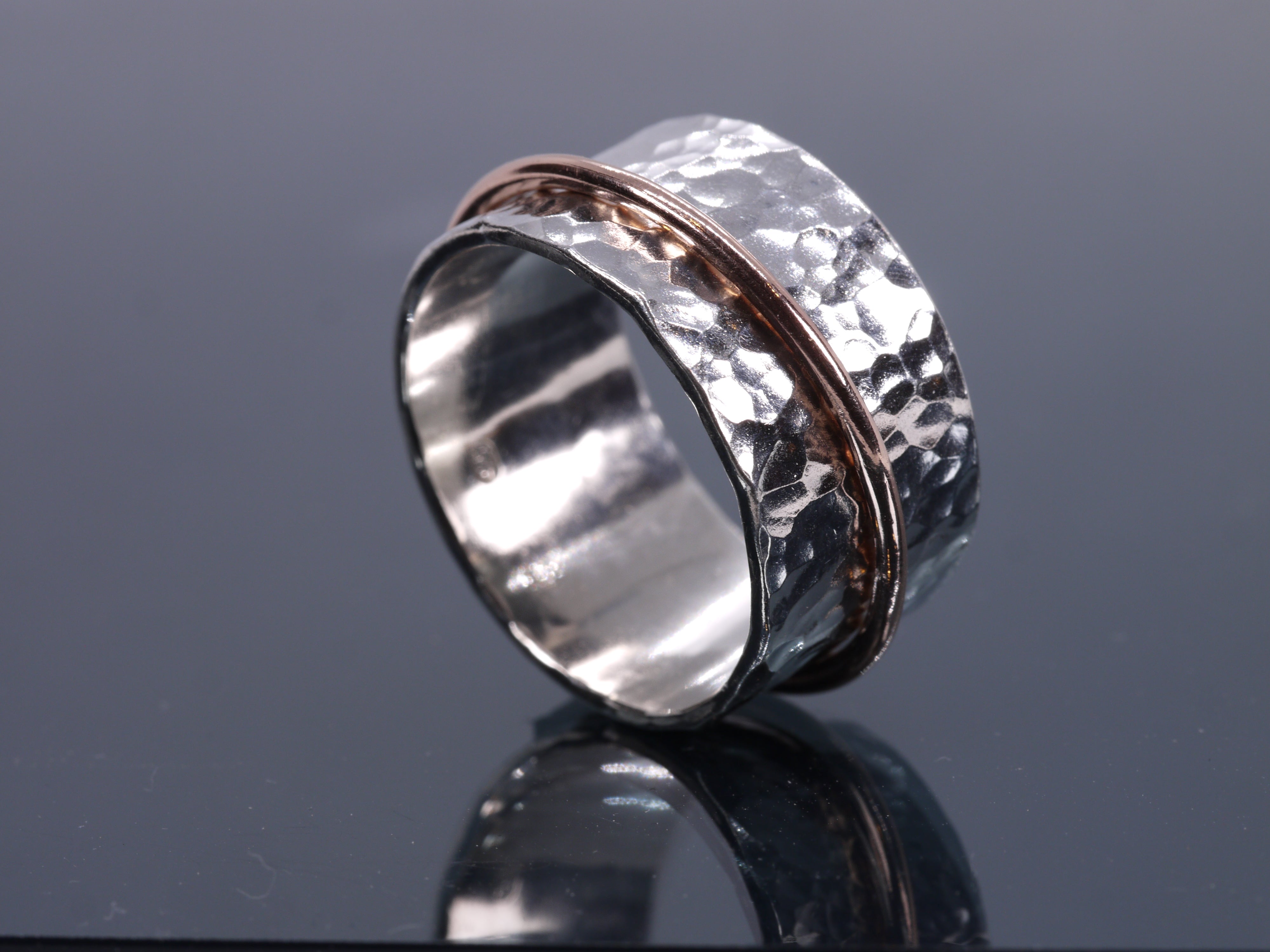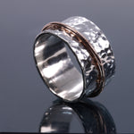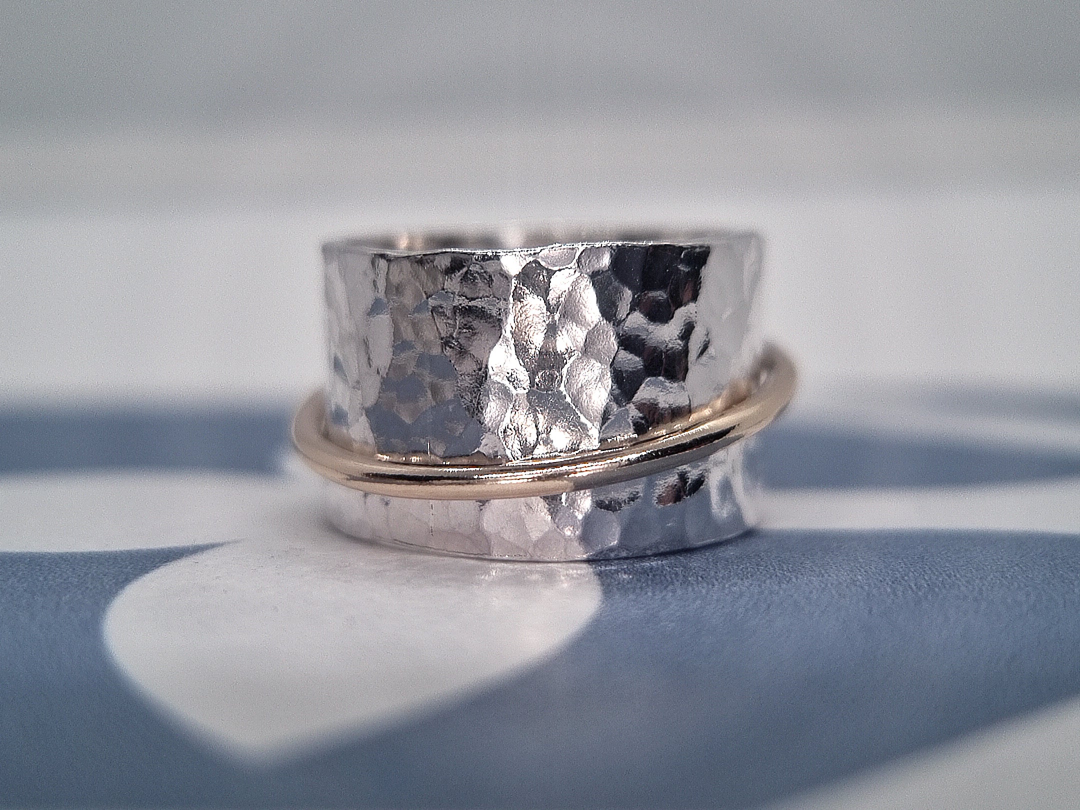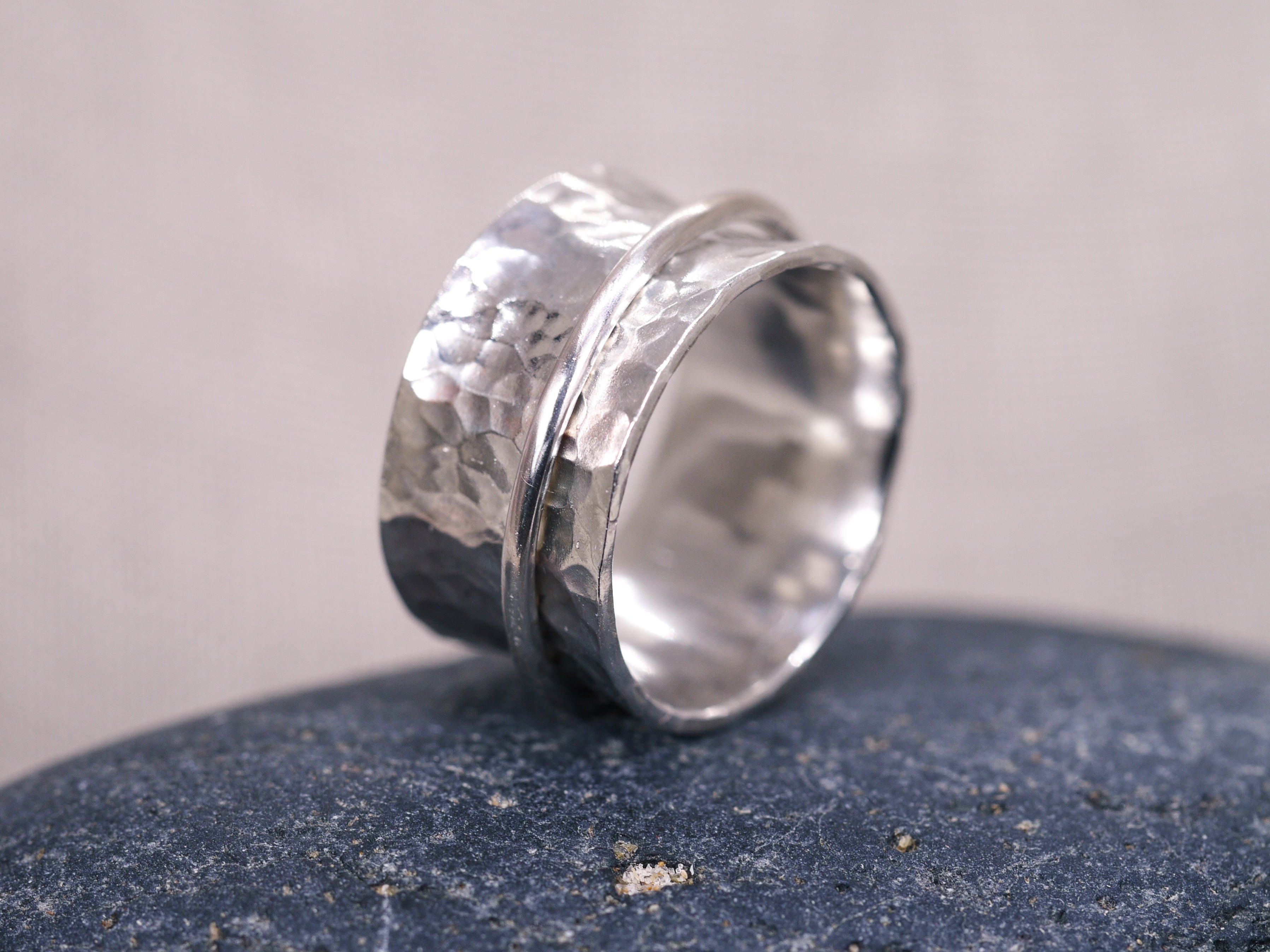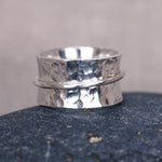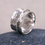 A simplistic spinner ring with a hammer textured base, adorned with a mirror polished halo spinner band.