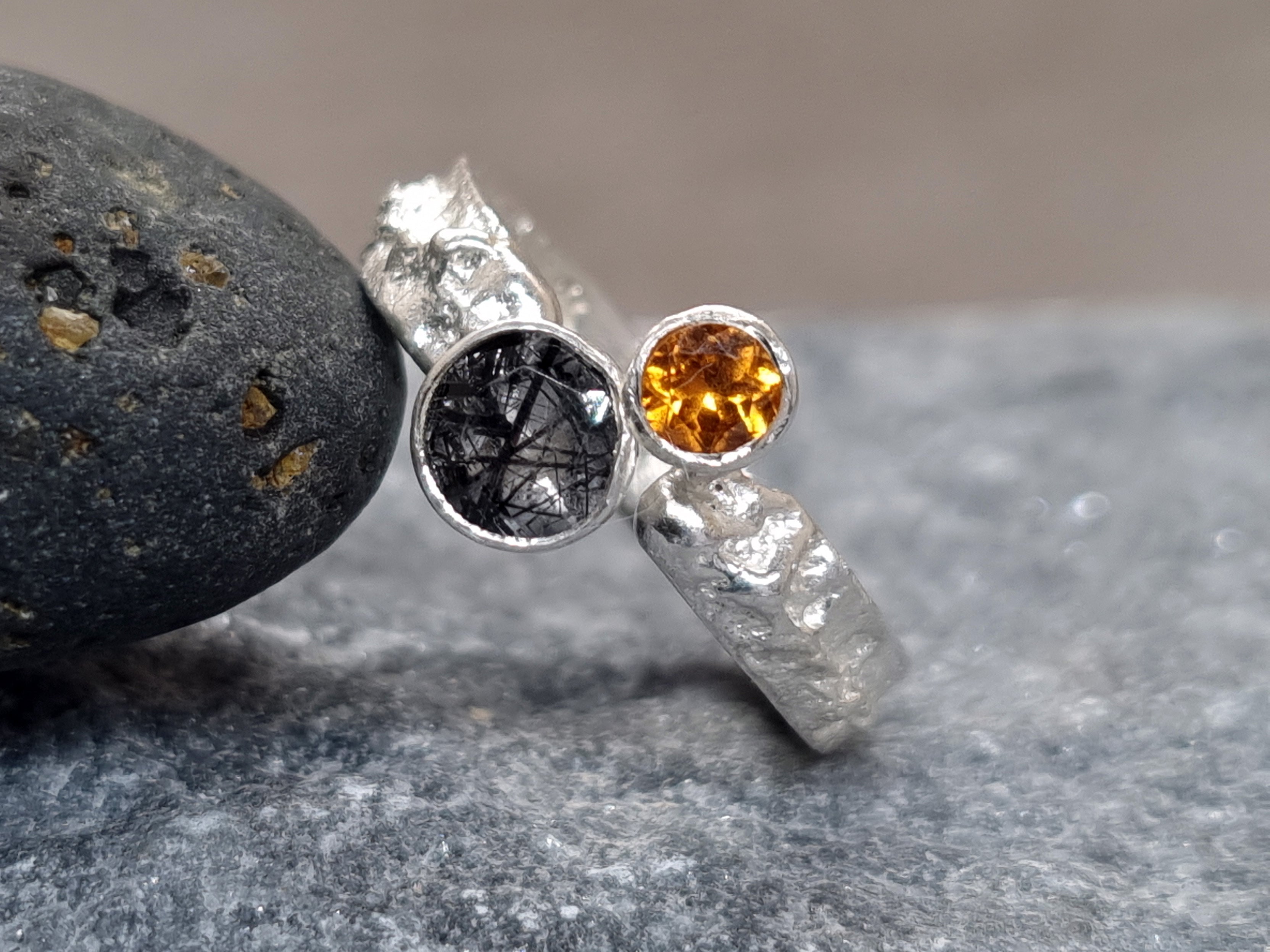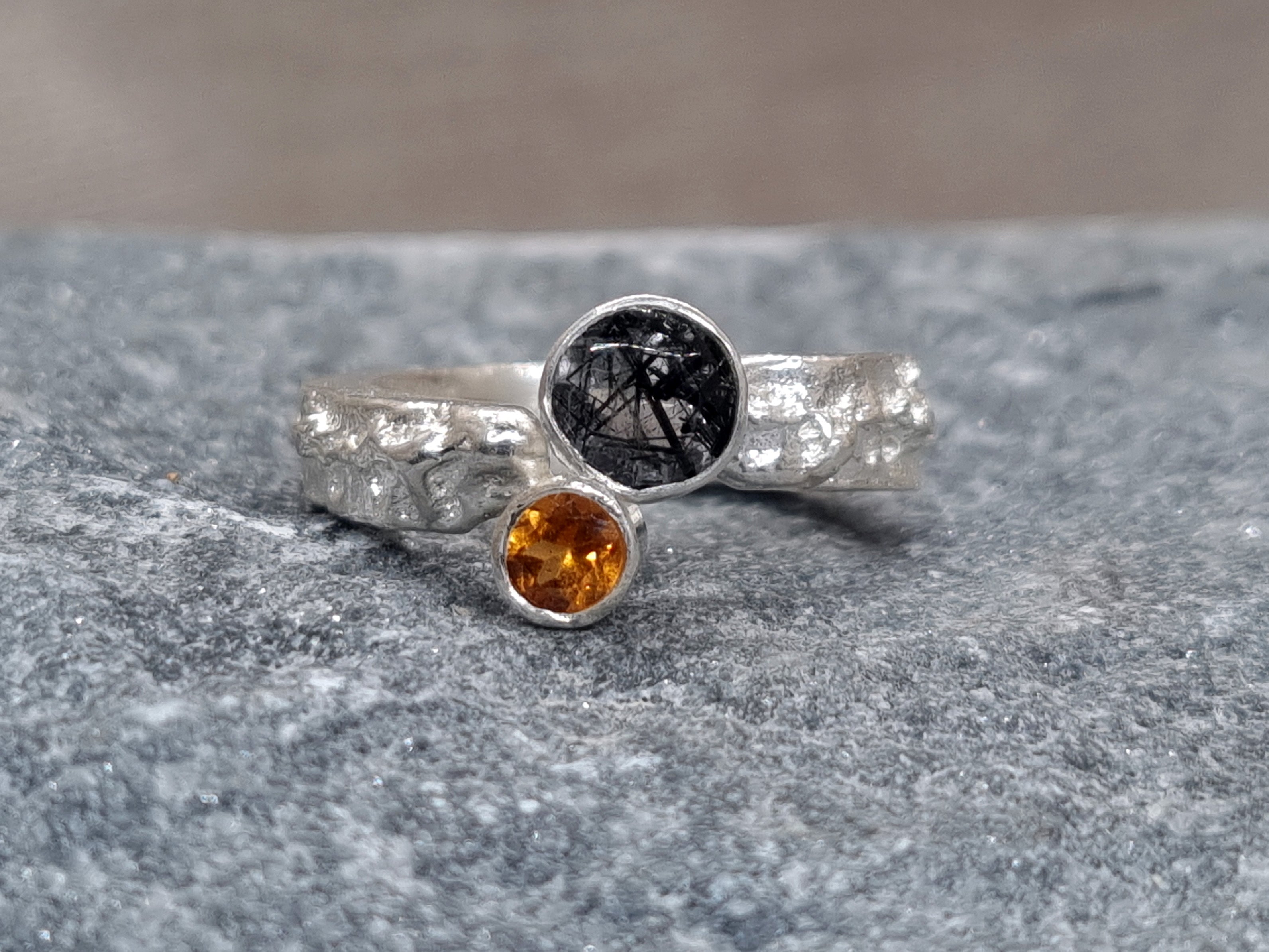 SUN ECLIPSE Terra Ring - Hessonite Orange Garnet and Black Rutile Quartz