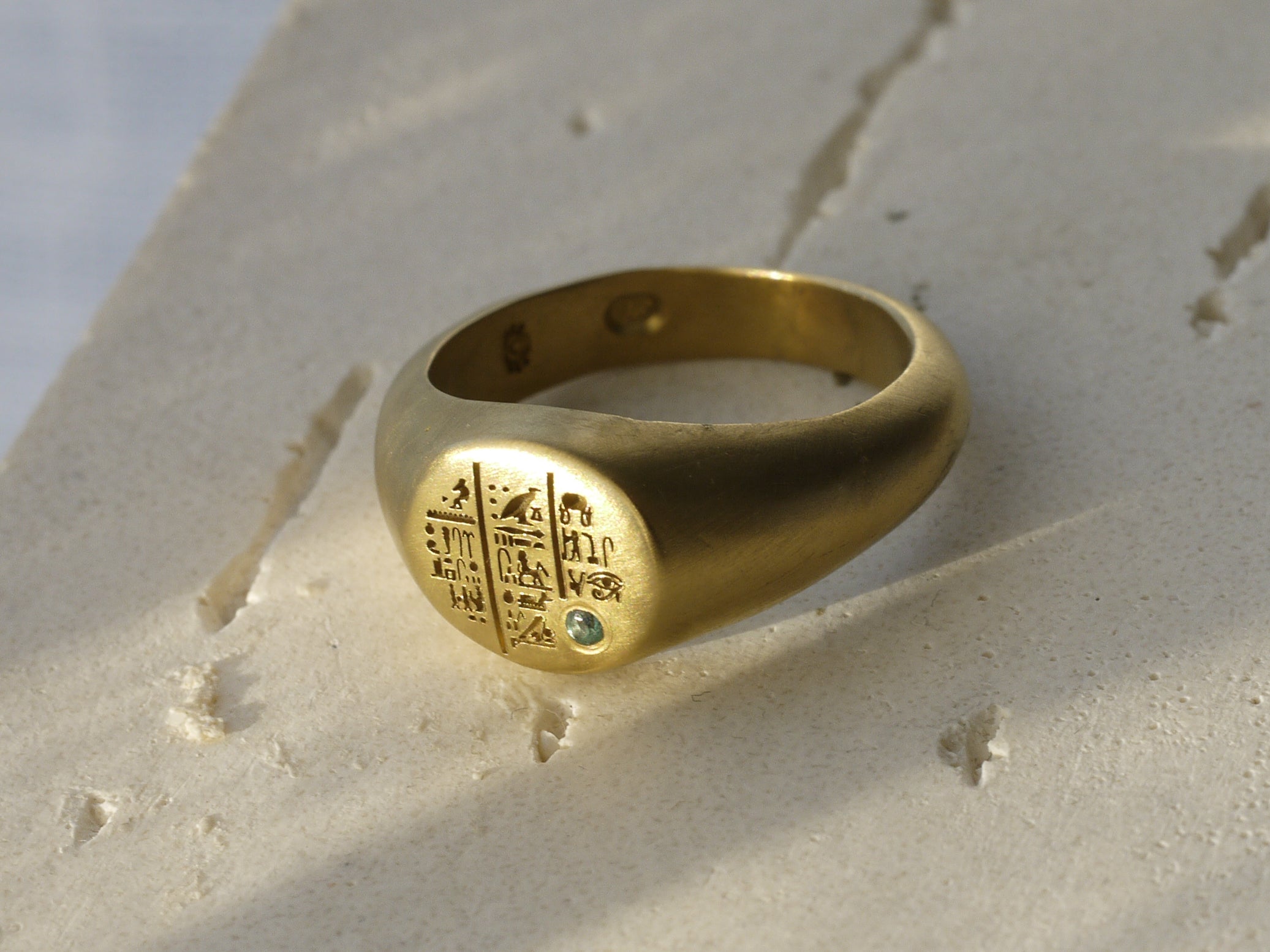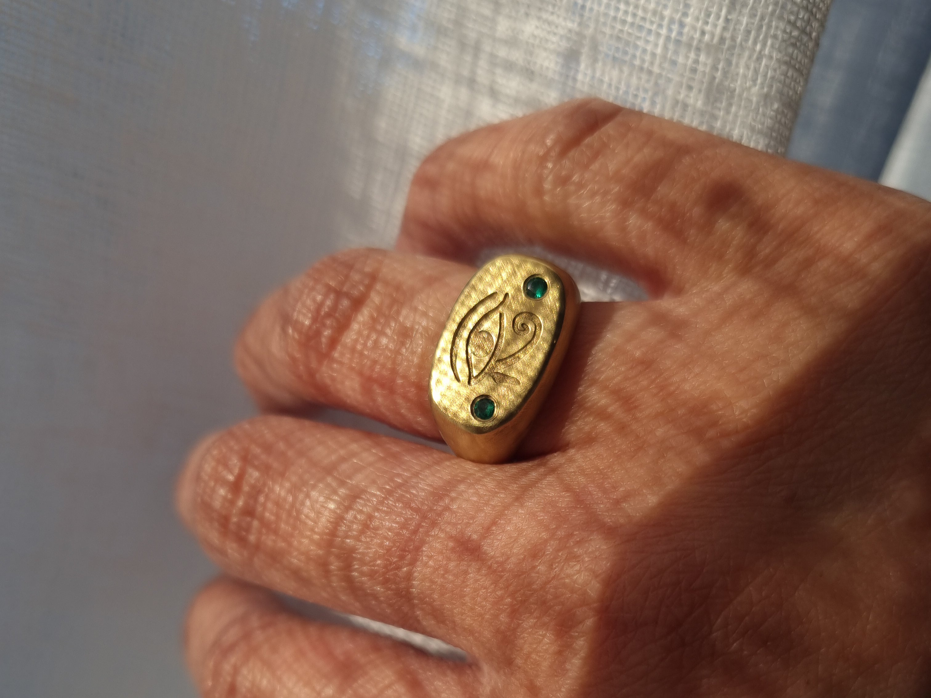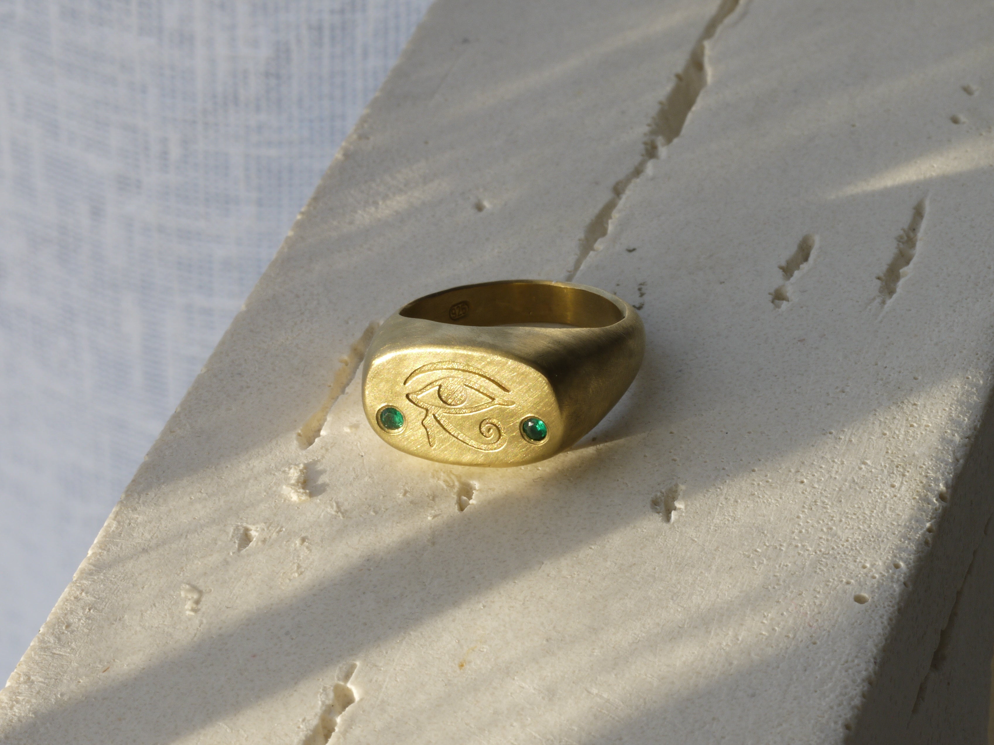 Eye of Horus Cushion Signet Ring with Lab Emeralds - 22k Gold Vermeil