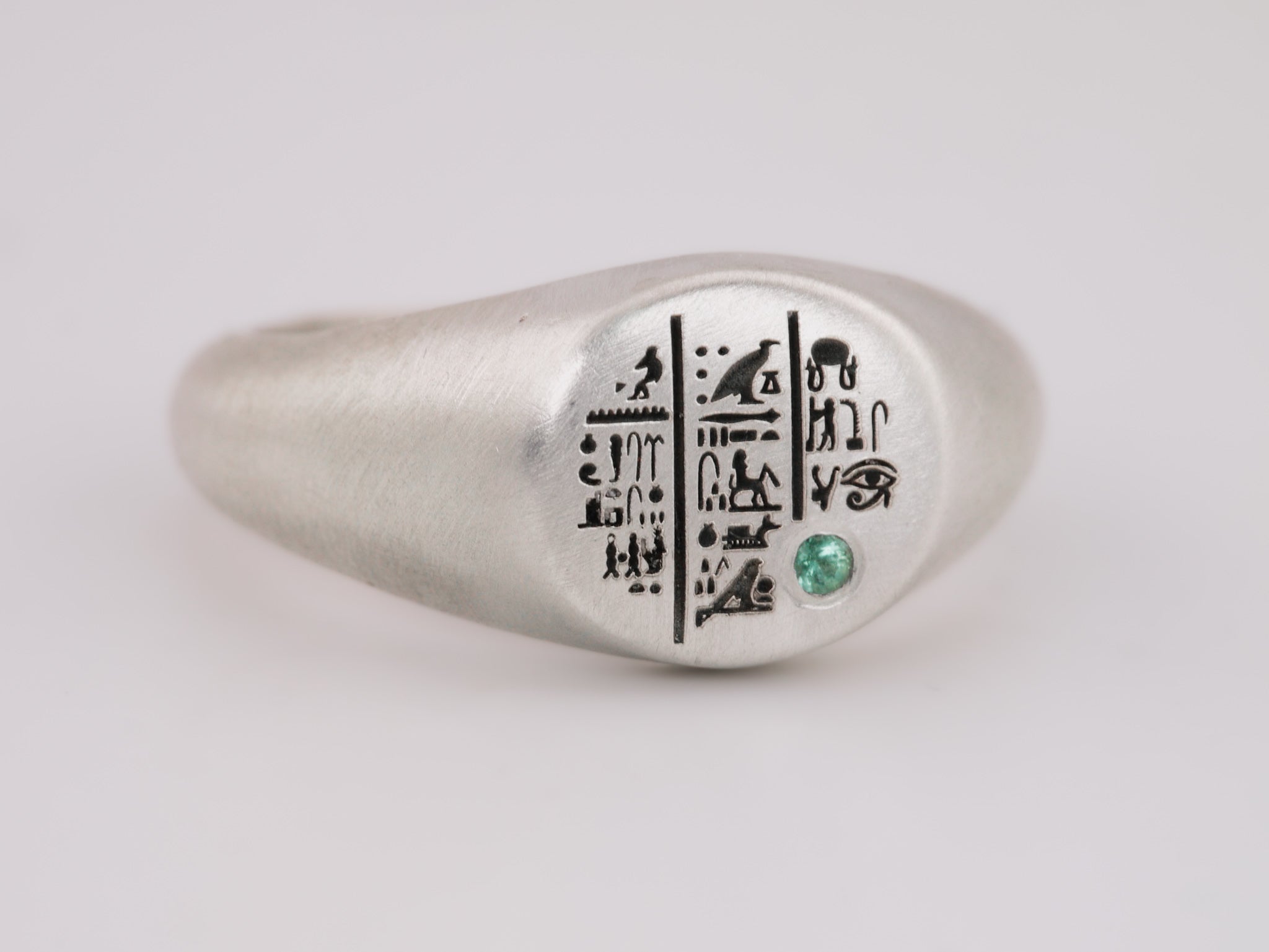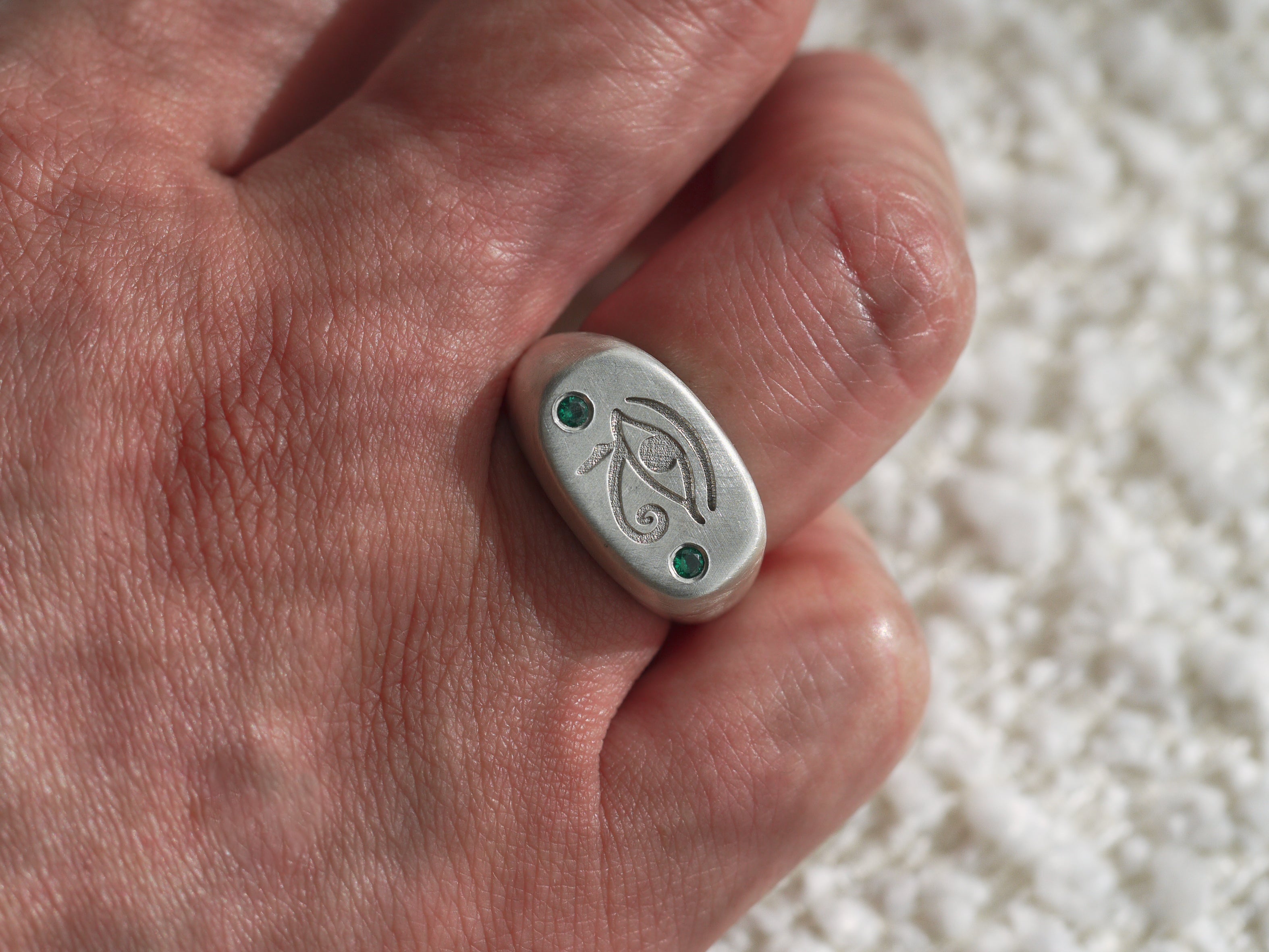Eye of Horus Cushion Signet Ring with Lab Emeralds - Sterling Silver