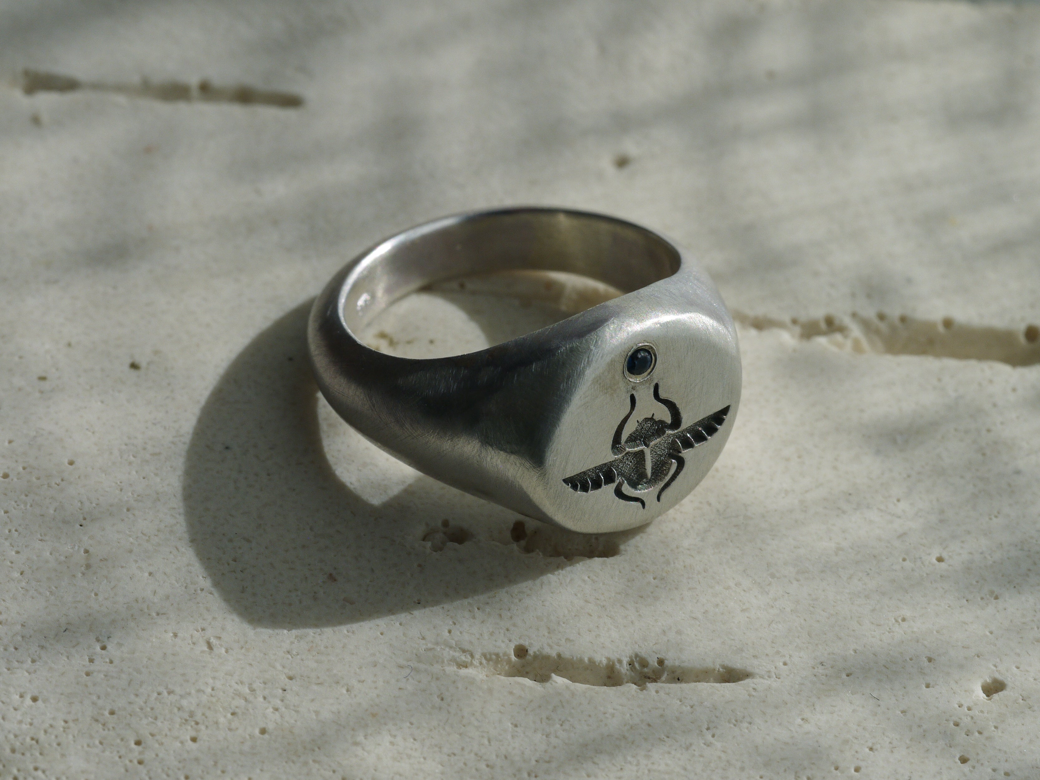 Scarab Beetle Signet Ring with Sapphire - Sterling Silver