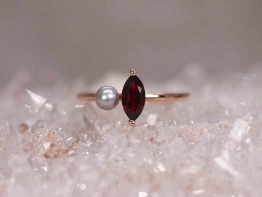 LUCIA Duet Ring - Red Garnet Marquise & Grey Freshwater Pearl