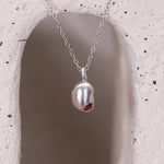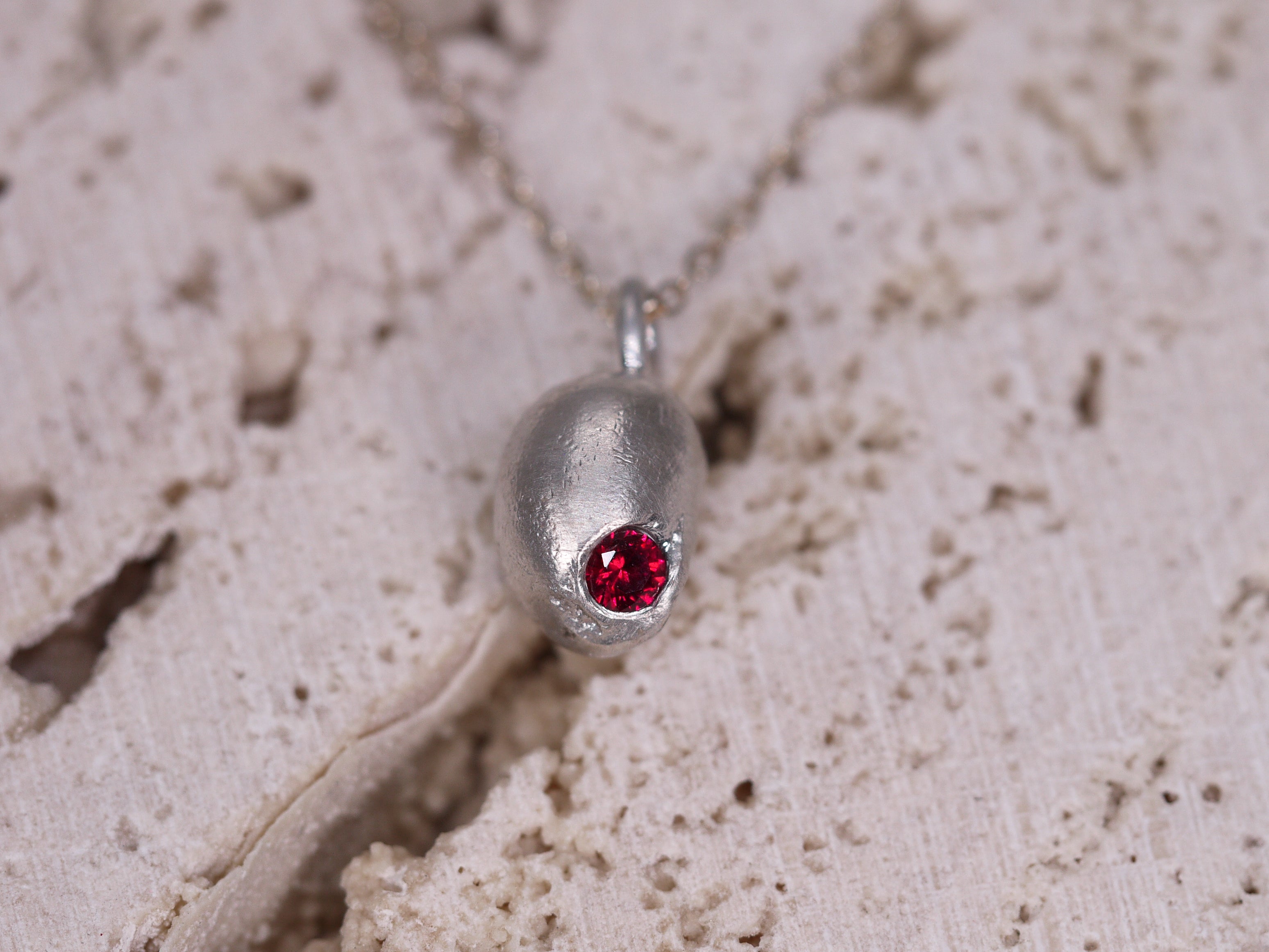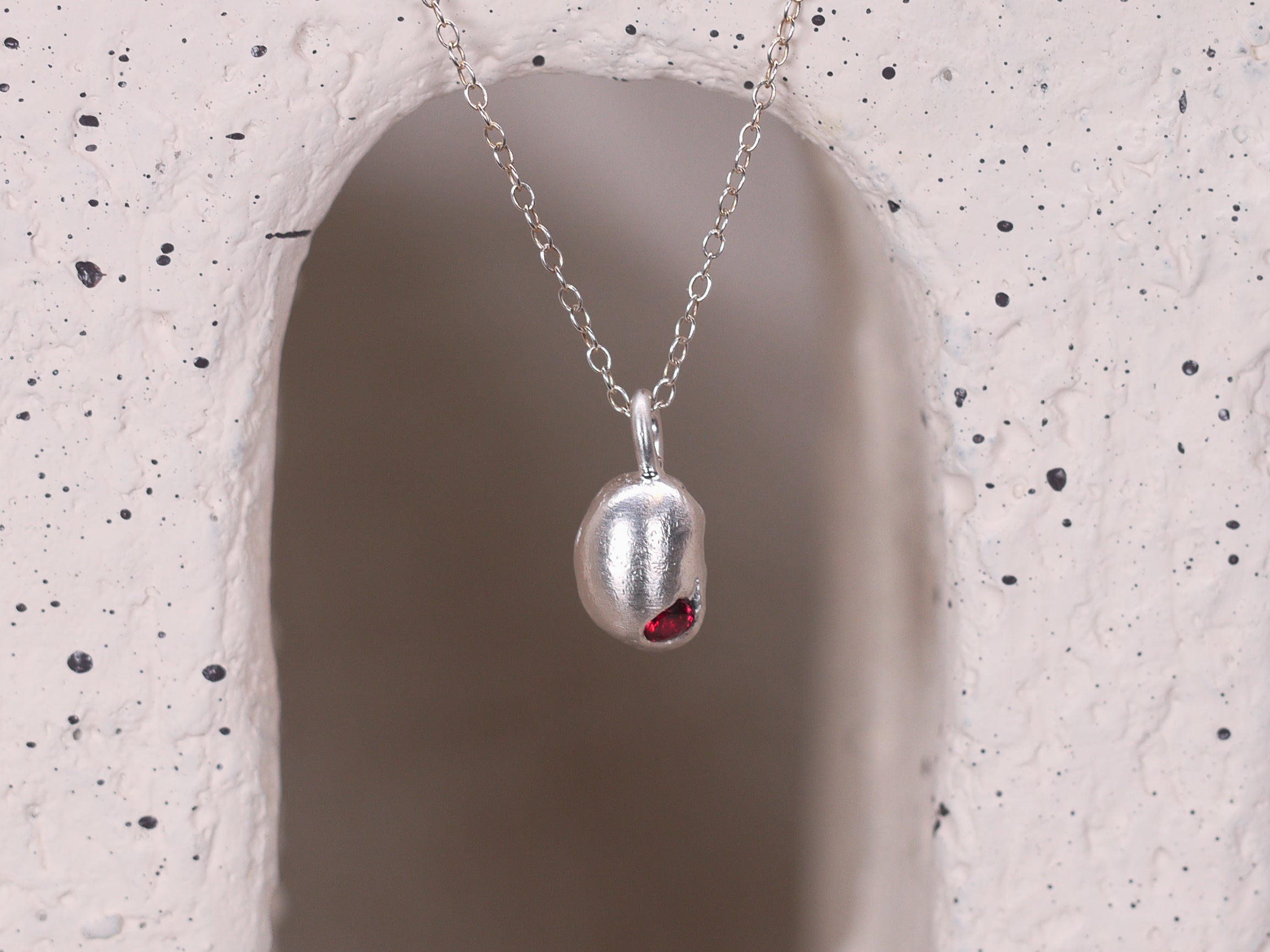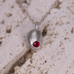 Within the pendant lies a bright red lab Ruby, which serves as the focal point of the necklace. The ruby's vibrant colour is complemented perfectly by the subtle texture of the sand casted bean, creating the cutest eye-catching piece.