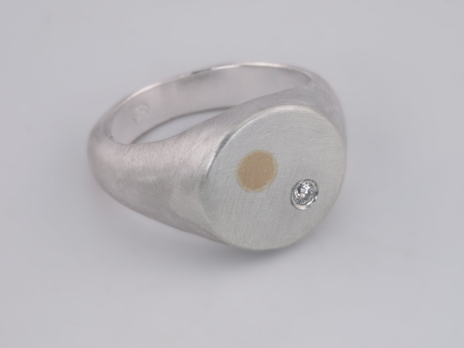 The Helios Ring is an artisan round face signet ring featuring a 2mm moissanite, selected for its brilliance and clarity. Rising over the moissanite is a 4mm round inlay of 9k yellow gold, signifying the rising sun.