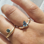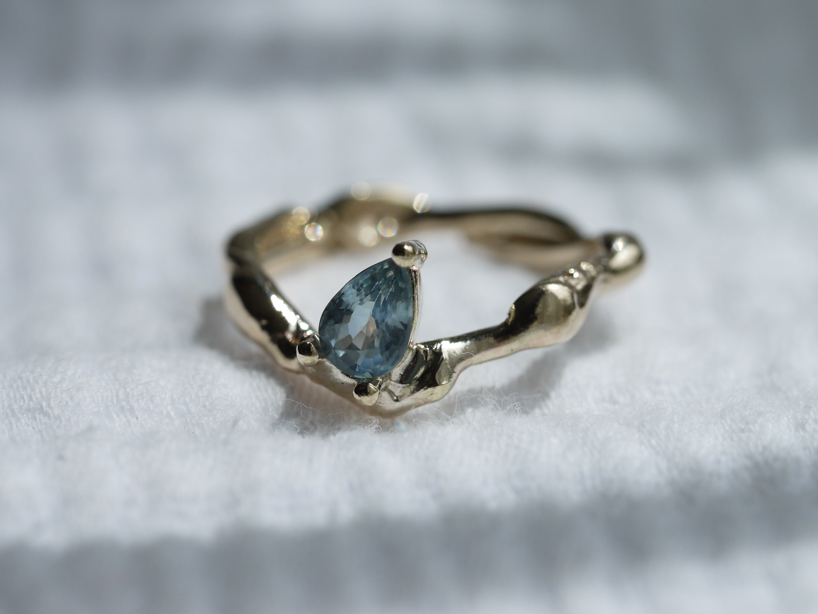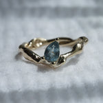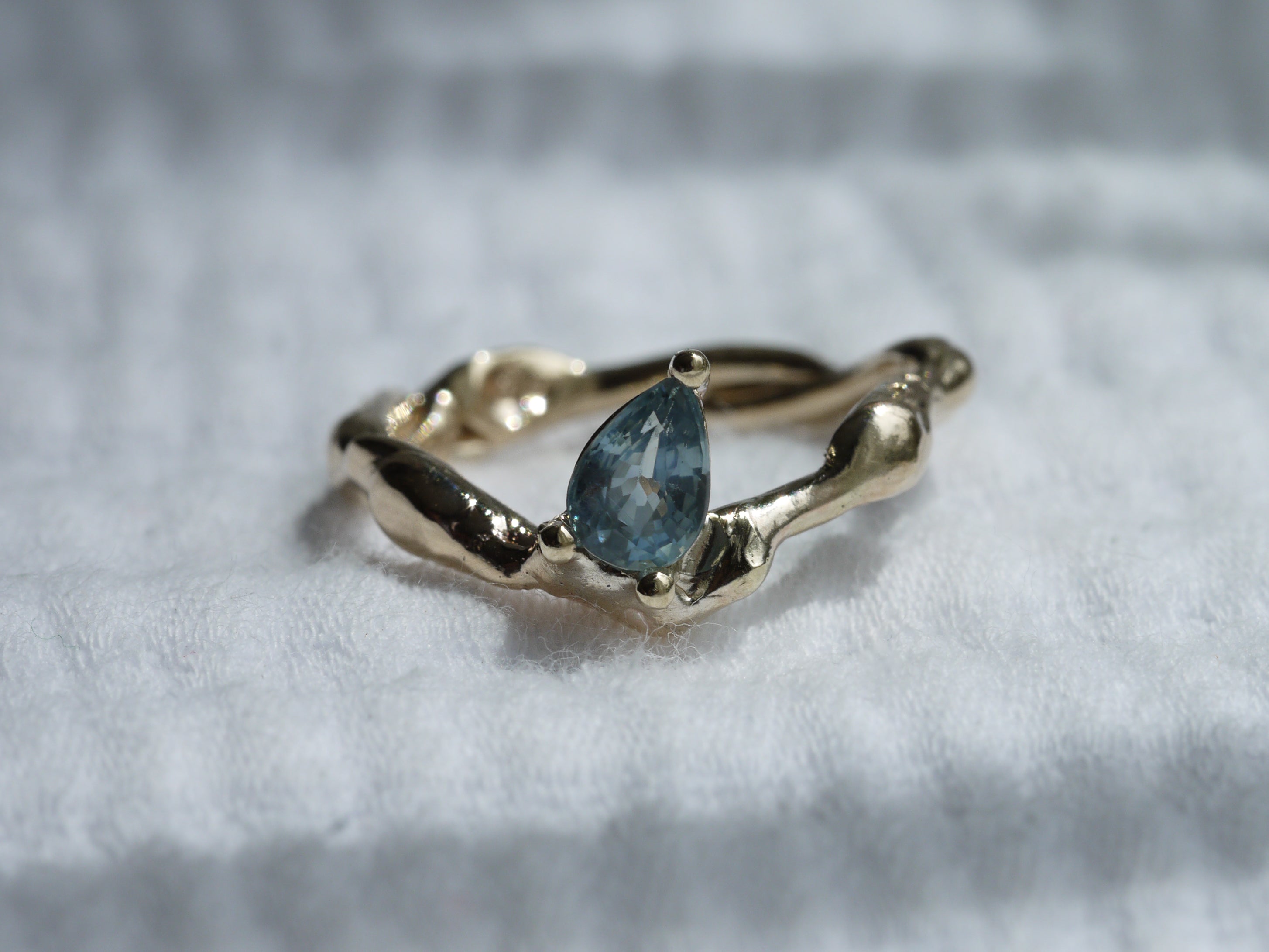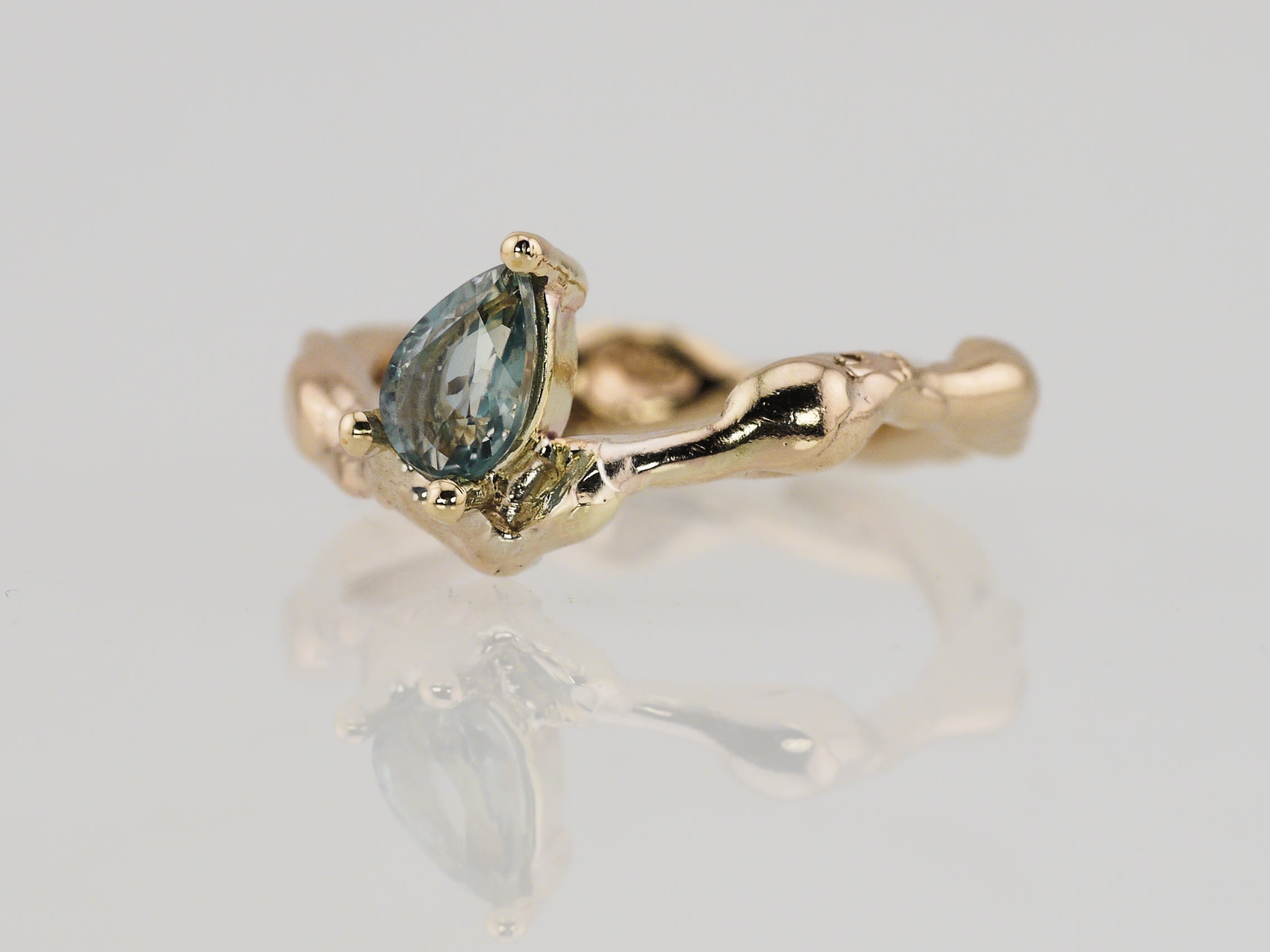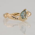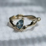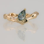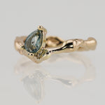This one of a kind Molten ring is made in solid 9k yellow gold and set with a seafoam teal 1.0ct pear cut sapphire.
