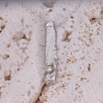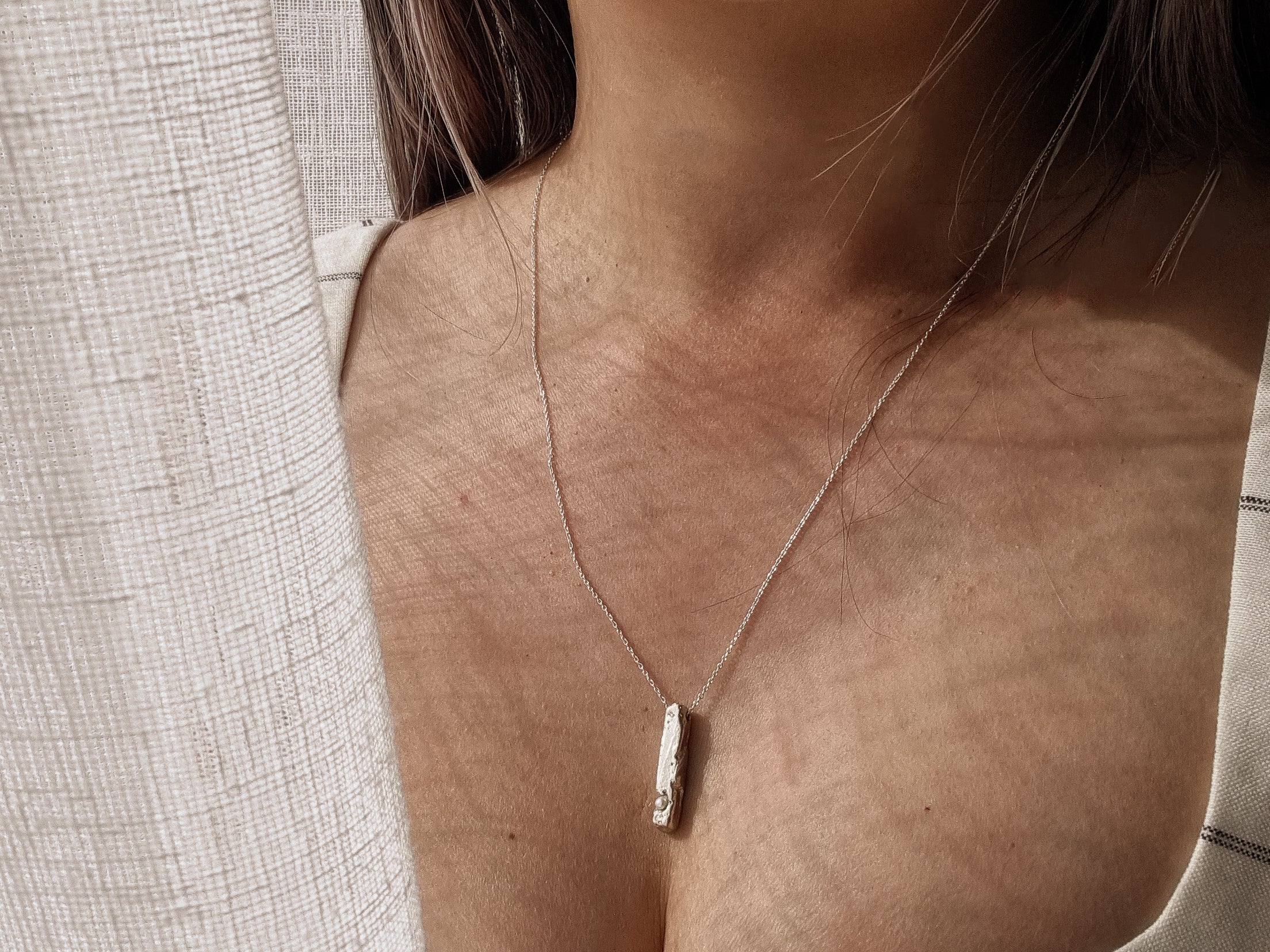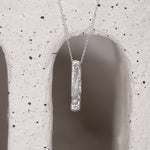 The sand casted Remnant Bar pendant necklace is a simple yet intriguing piece of jewellery that is crafted using a sand casting technique, which gives the silver a beautiful and unique texture.